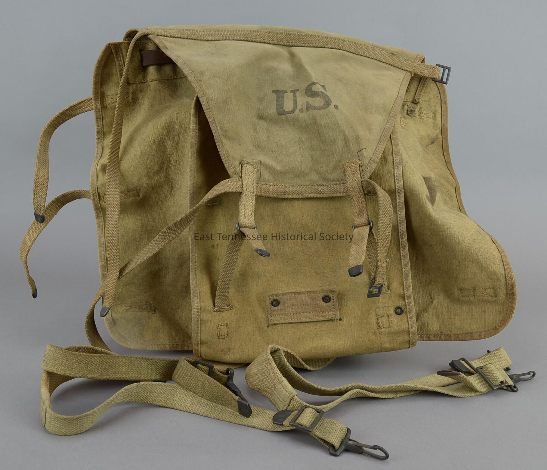 Field pack belonging to Robert Barnes "Bob" LaForge Jr. (1885-1956), cloth/leather/metal, Model-1910 made for U.S. Army, place for mess kit at upper outside/held in place by entrenching tool, tail (apron) for holding bedding, marked "U.S," outside top marked "U.S." with printed initial "H.B.P." on inside strap below, inside tail marked "LONG/8-18," marked "F.H."(?) on upper mid-section on proper left, inside top marked "R.I.A. / 1917," manufactured by R.I.A. [Rock Island Arsenal (New York)]*, 42"h x30"w x 1/8"d, 1917.Made/Created