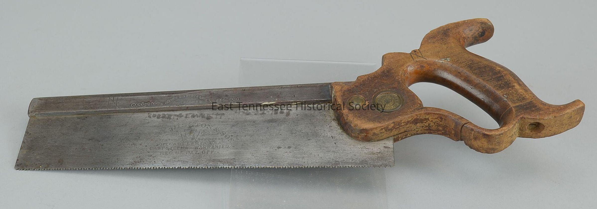 Back saw, tenet dovetail, carved wood handle with tapered metal blade held with two brass screws, one with small medallion "H. Disston & Sons," "Robert Emmett 415321867" (social security number) etched on blade, 5 1/4"hx 15 1/8"l, curved "HENRY DISSTON & SONS" (dates),post 1900/maybe c. 1914.
