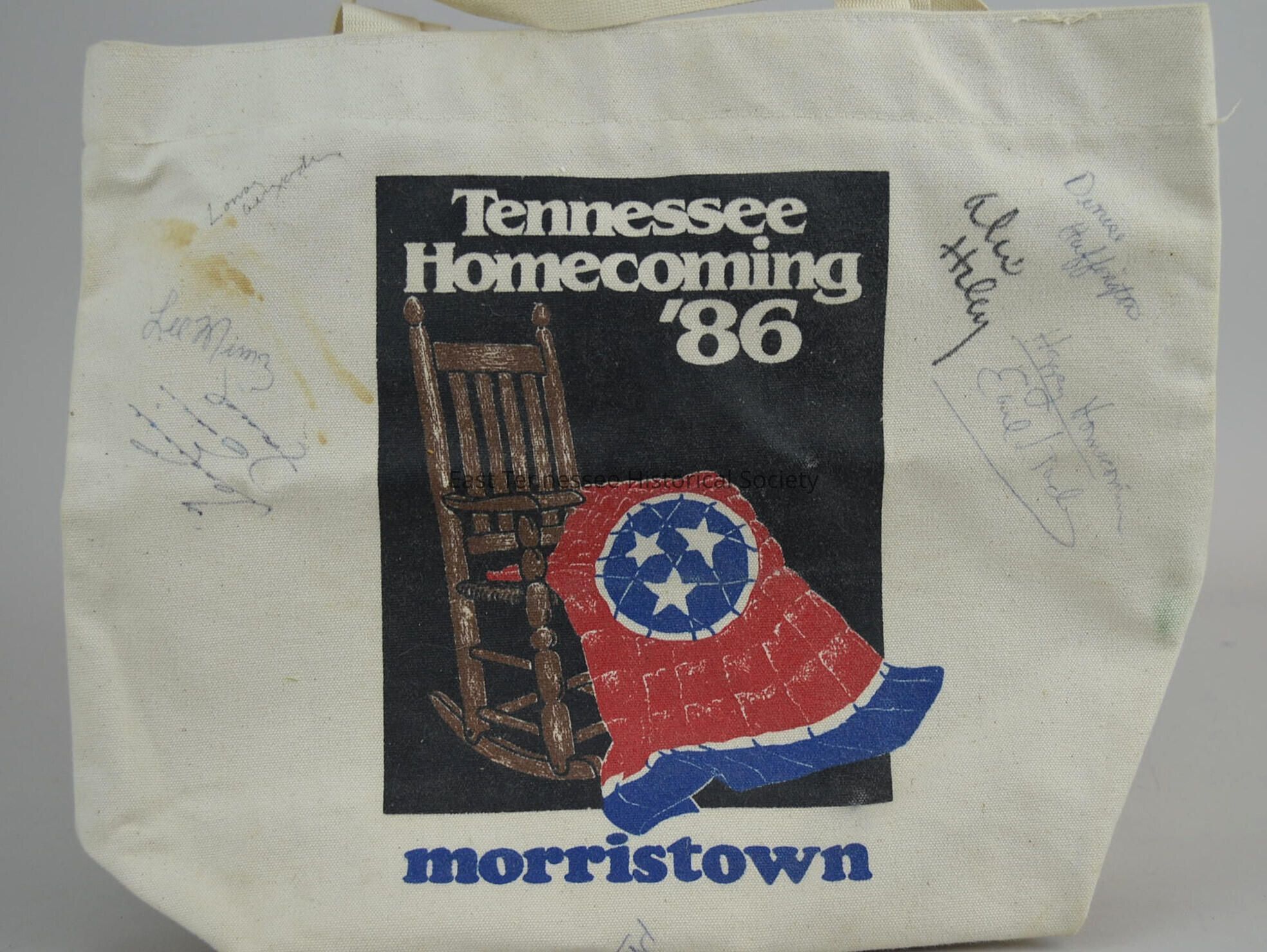 Tote bag, ecru-color canvas, Tennessee Homecoming '86 logo-rocking chair with Tennessee state flag draped over its front and "Tennessee / Homecoming / '86"--in black square centered on obverse with "morristown" below, seven autographs around logo including Lamar Alexander [siting Tennessee governor], Tennessee Ernie Ford and Alex Haley [Homecoming '86 co-chair], 14 3/4"h x 15 3/4"w + pair of fabric handles, 22 1/2"h x 15 1/2"w x 1/2"d, 1986.Made/Created