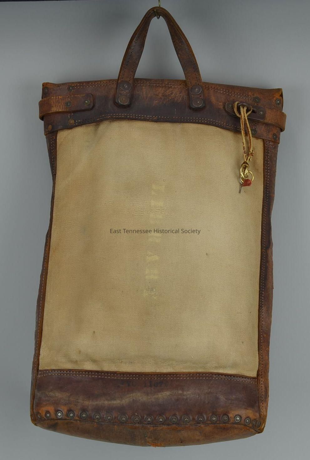 Bank duffle bag, made of khaki canavs and brown leather (at top, bottom, sides), stamped "GOLD BOND / LUGGAGE" on leather at top front between triple handle straps and "PVO 11O70" on leather at center bottom front, steel buckles arranged horizontally on reverse through which leather locking strap encircles bag top, place for padlock at top right front, "LIBRARY" in faint stenciled letters centered vertically on front, copper rivets, 25 1/2"h x 15 1/8"w x 4"d, date unknown/early to mid 20th century.Dimensions