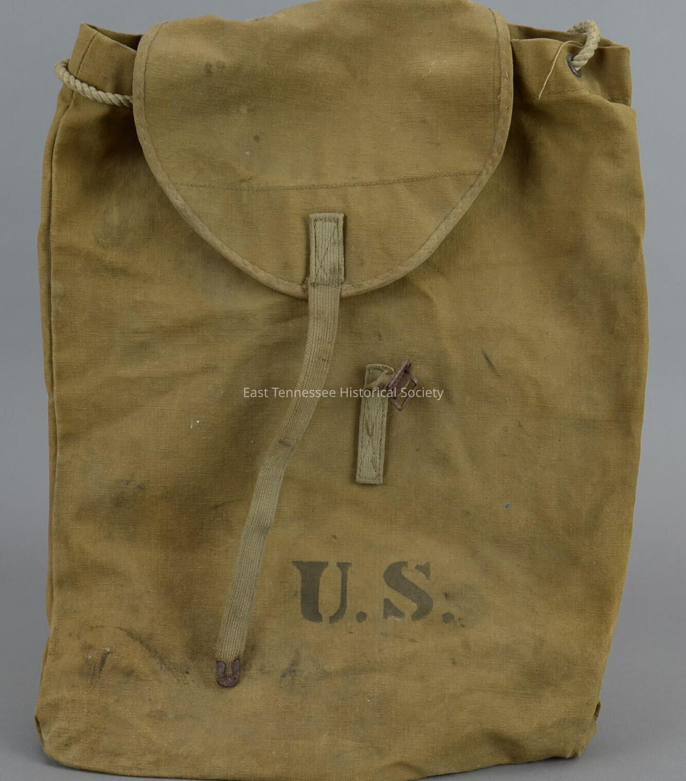 Ditty bag belonging to Robert Barnes "Bob" LaForge Jr. (1885-1956), dark-khaki cloth/metal, flap with single strap, front marked "U.S," rope used to tighten mouth of long back of bag, two light-khaki shoulder straps with adjustable metal buckles having light coat of black paint, manufacturer unknown, 36"h x 14"w x 1/4"d, manufacturer unknown, 1917-1918.Made/Created