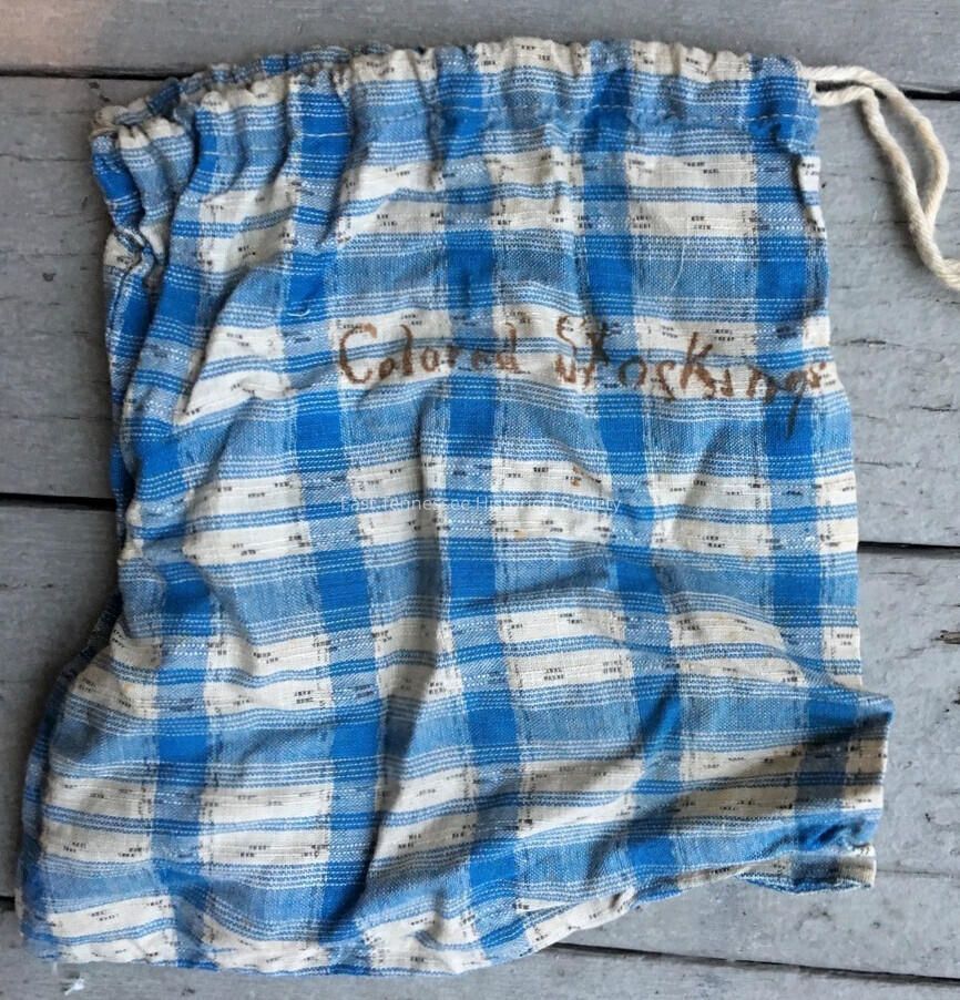 Stocking bag, blue-and-white check fabric, drawstring closure at top, hand printed "Colored Stockings" written in brown ink on front side, 7"h x 7"w, c. late 1800s-late 1920s*.