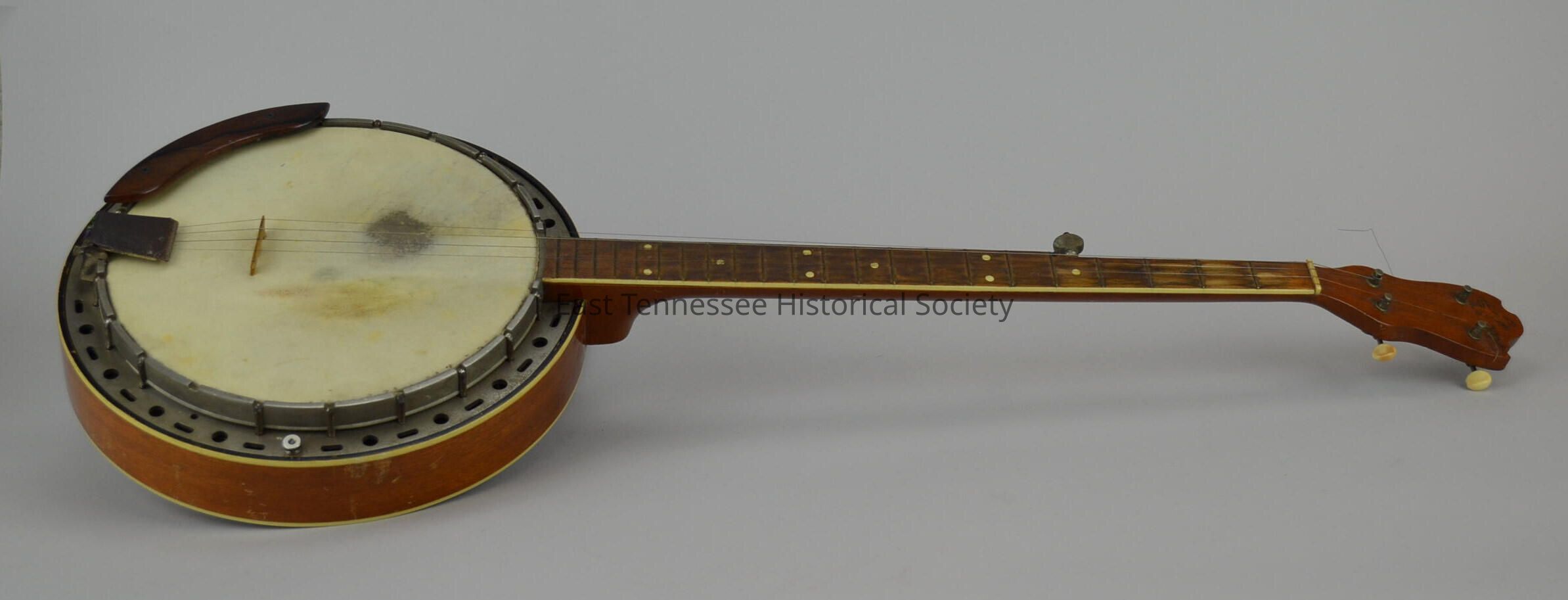 Banjo owned and used by Cal Davenport, five strings, light and dark woods, steel ring with cream-colored head, Bakelight or ivory trim and tuning buttons, closed reverse, manufactured by Kay, 38 3/4"h [upright] x 13 3/8"w x 4"d, c. late 1930s-early 1940s.Made/Created
