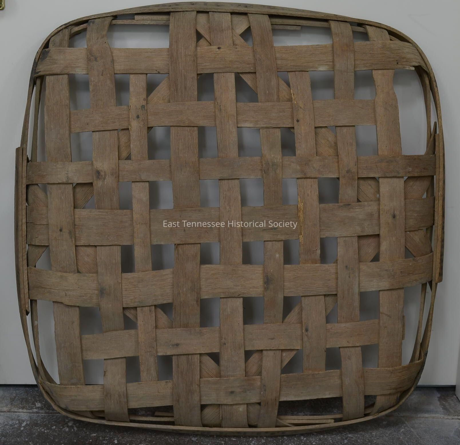 Note: Tobacco baskets were utilitarian flat-slat tray-like forms, usually four feet square with a shallow depth of four to five inches. They were woven very loosely and held together by a frame and nails. Cut tobacco was piled high on these flat baskets to move the tobacco from field to curing barn and also to transport the cured leaves to market.Made/Created