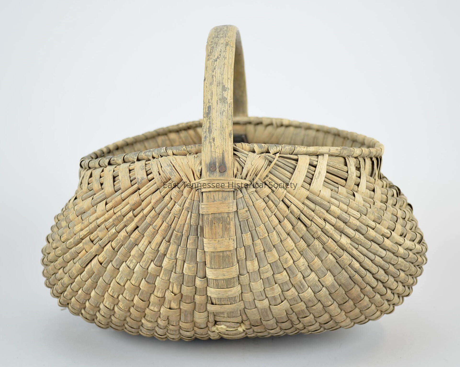 Basket attributed to Sevier County, oak splits over framework of ribs, no crossed or X weave on handle attachment/only horizontal weaving, two nails where each end of handle meets rim, 12"h x 14 1/2"w x 13"d, date?/late 19th-early 20th century.Made/Created