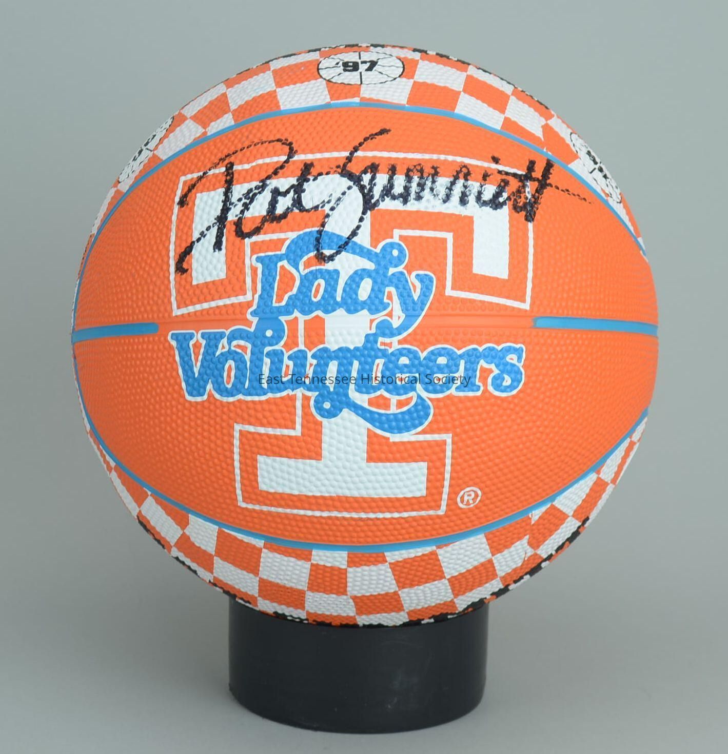 Basketball signed by then University of Tennessee women's basketball coach Pat Summitt, orange ground with white checkered ground on opposite side, pebbled surface, marked "PAT SUMMITT / 800 WINS / JANUARY 14, 2003" on one side, marked "NATIONAL CHAMPIONS" on other side surrounded by years--clockwise '89 at top/'91 and '98 on right side/'97 at bottom/'96 and '87 at left, below is white T and blue-outlined-in-white "Lady / Volunteers," signed "Pat Summitt" in black magic marker on T above "Lady Volunteers," Baden (China), official size 28.5 and weight, 8 3/4" diam., 2003.Made/Created