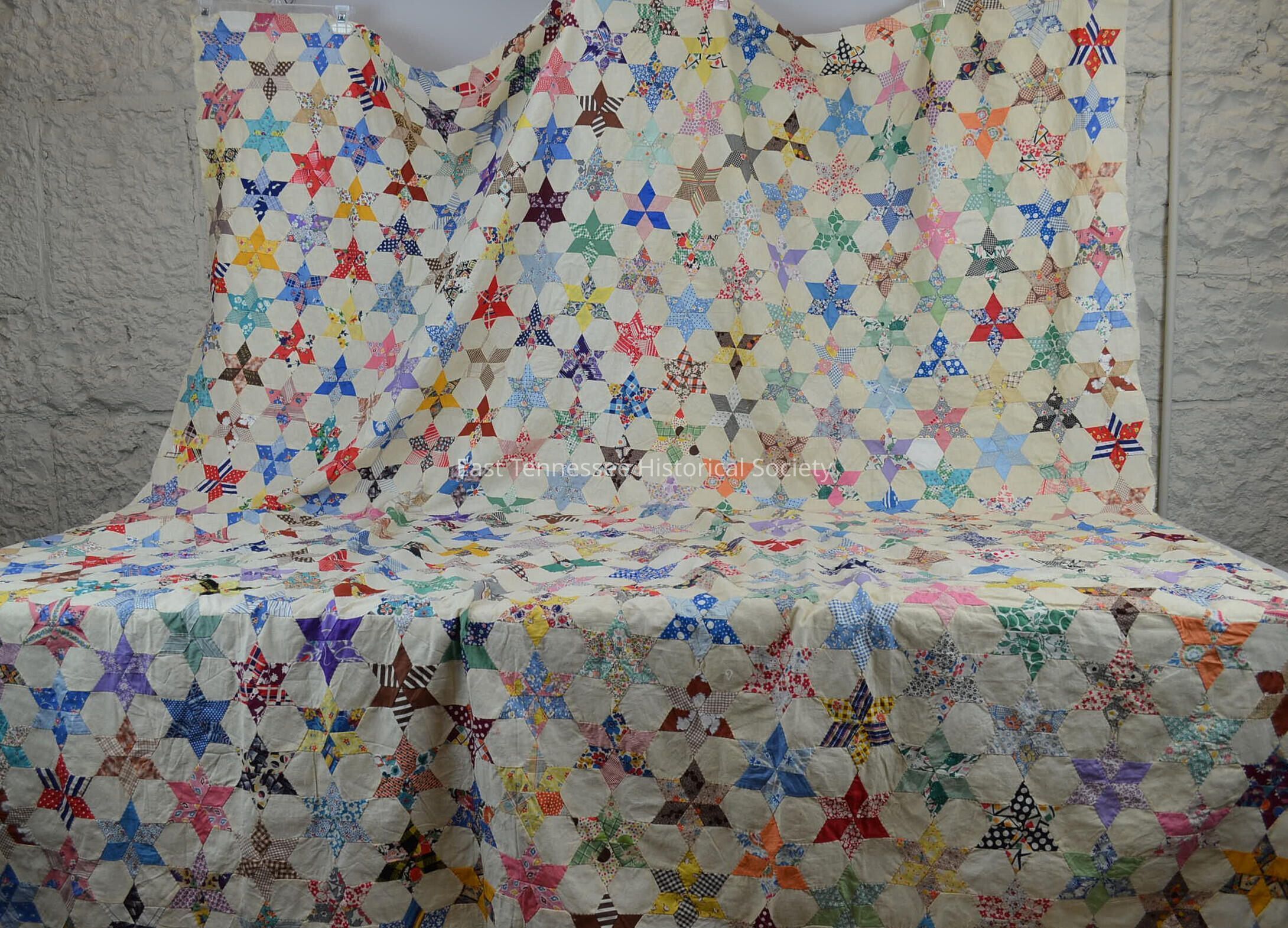 Quilt top by Anna Dunlap McConnell, Six-pointed Star pattern, cottons in mix of coordinating prints or prints with solids, rows of six-pointed 5" stars made of six coordinating 1" x 2" fabric diamonds, stars set together with cream muslin hexagons, one white hexagon at right side 20"from top and 13" from right edge, 82"h x 77"w, 1930s.Collection