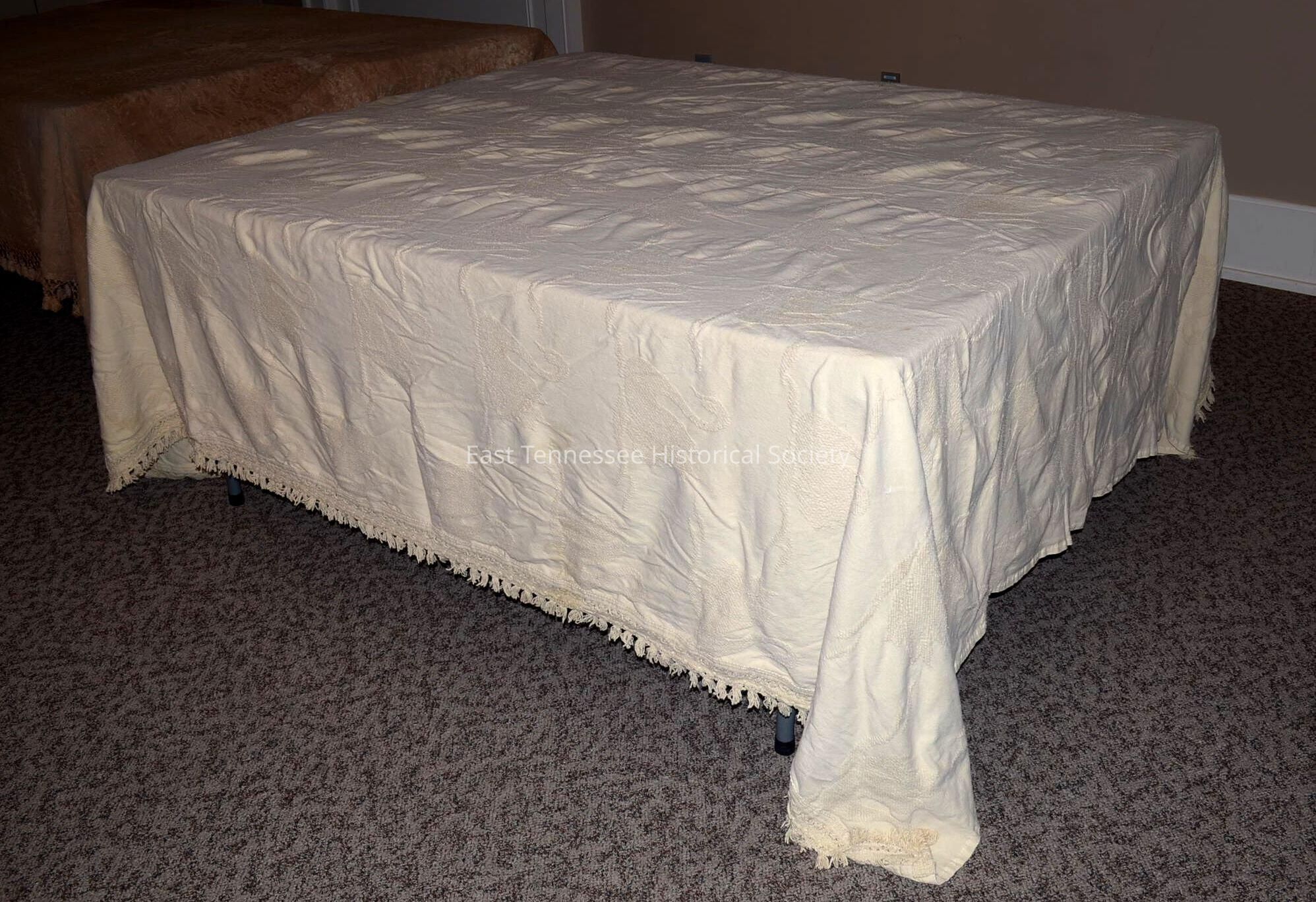 Counterpane/bedspread, white cotton, machine woven, swan design of rows of swans/one row of five, next row of four, top row begins in mid-swan, eye detail on swan/water waves below, imitates embroidery, round corners, 4"w hand-woven fringe tape sewn on three sides, 10'h x 8'8"w including fringe, manufacturer unknown, date unknown/19th century.Collection