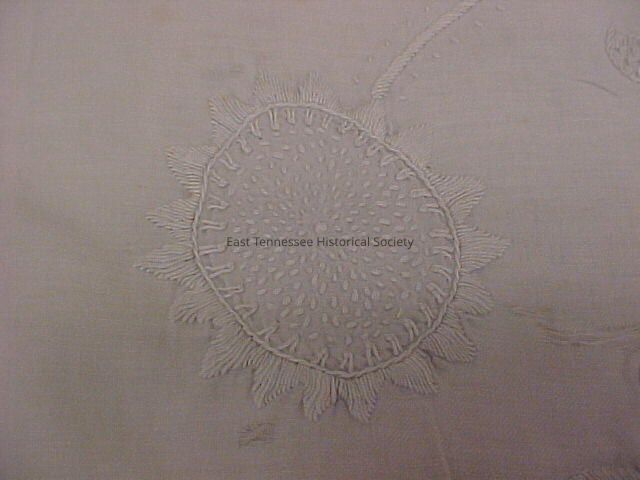 White bedspread believed made by Ellen McClary Carmichael, embellished with white candlewicking (embroidery using heavy thread) to create three-dimensional designs. Center portion features a 34.375" x 24.25" rectangle with ivy-patterned sides. Inside rectangle is an ornate flower pot with blooming grape vines, heart-shaped flowers, sunflowers, and a fan-shaped flower. Sides of spread are decorated by checkered urns blooming with many kinds of flowers and leaves. All flowers are textured. Length of plants depends on side (longer sides have longer blooms). Edges are decorated by a border of alternating lemon and diamond shapes. Decoration not present on top edge. Fringe has been added to all sides of spread except for the top.Made/Created