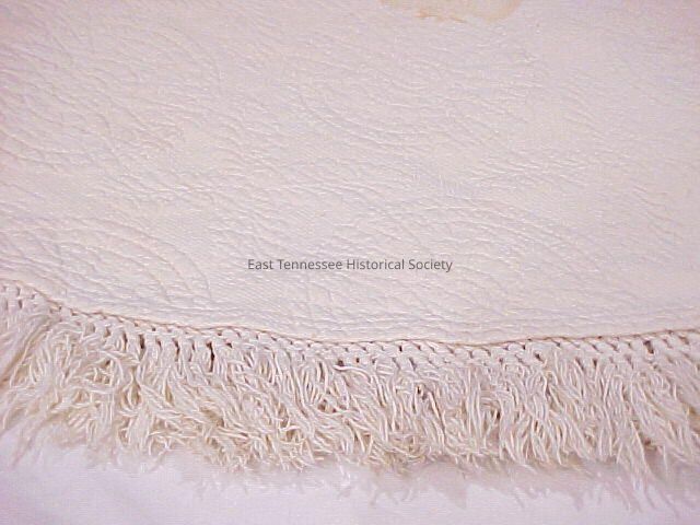 Whitework bedspread with fringe on three sides, label reads "Bates Heirloom / 1850-1950."