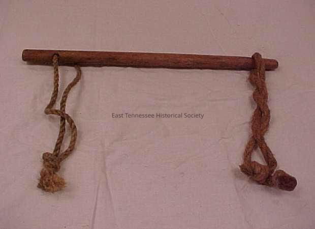Narrow piece of wood with a hole drilled into each end. These holes fall on opposite sides of wood. A piece of f rope has been threaded through each hole and tied into a knot at the end. Known as a "twister" within the Frazier family, twisted around the animal's (horse, mule) upper lip and secured to wall hook to keep the animal in place. c. 1900Collection