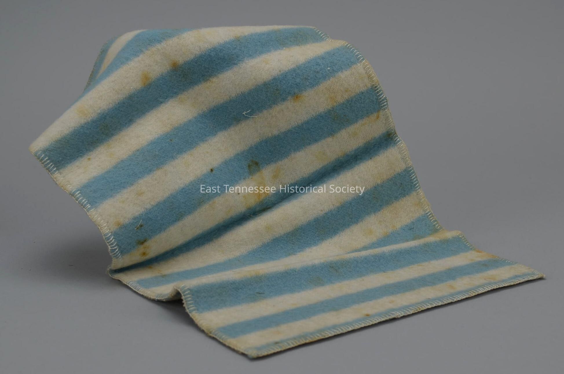 .2) Blanket for doll made (by tradition) by Margaret Cecil Peak Bundren, blue-and-white horizontal strip fleece, bound on all sides with light-blue pearl cotton crochet edging, c. 1911.Made/Created