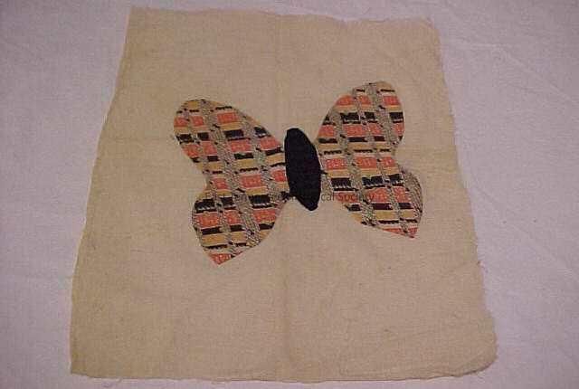 Quilt block. Multicolor butterfly set on an ecru background. Butterfly has black body. Wings are made from multicolor fabric consisting of horizontal bands of black, ecru, orange, and yellow. These are intersected by vertical bands of black and ecru. Green dots are present randomly throughout fabric. Body stitched with black thread. Wings are stitched with white thread.Collection