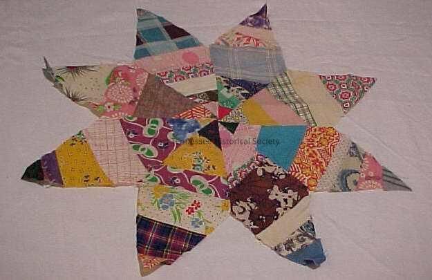 Quilt block. Eight-pointed star made from a number of different shapes including: triangles, rectangles, trapezoids, and others. Thirty-nine different fabric patters were used of varying designs and colors.Collection