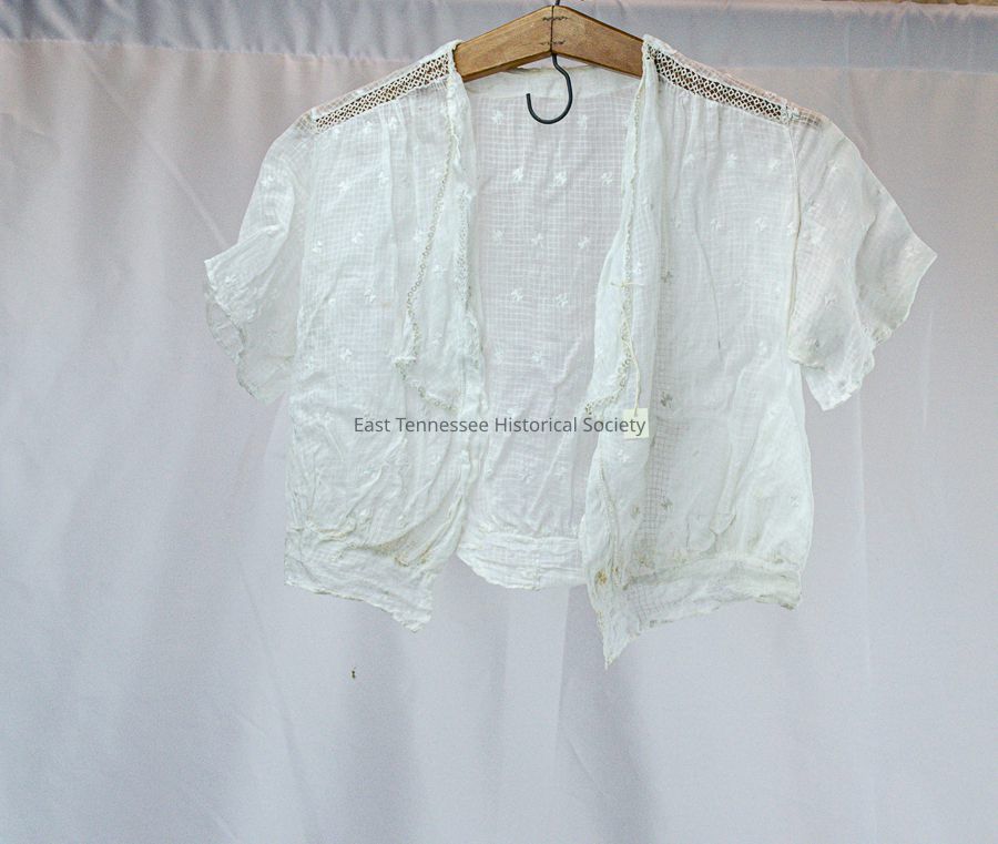Diminiity blouse/bedjacket of Della May Ketner, white, very short sleeves, no closures, lapels on each side of front opening extending about two-thirds length and trimmed along edge with tatting, self-fabric waistband, 1907 (later than 1907 in present form).Made/Created
