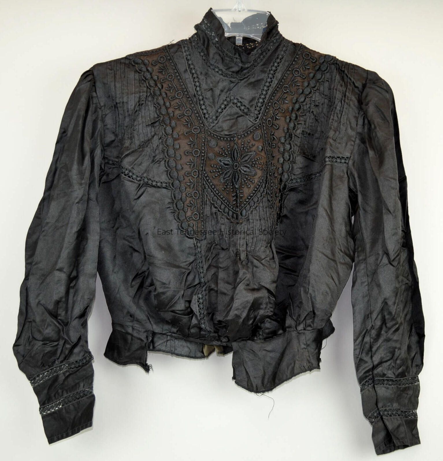 Shortwaist, black silk, stand-up collar with two lace inserts, tucks at shoulders, front and back lace inserts form W upper bodice below shoulder, tucks and both sides of center, net with heavy embroidery appliqued to front, puff sleeves with wide cuffs with two lace inserts, bottom front gathered onto band to form a pouch, peplum from front to back fits under waistband of skirt, buttons up back with concealed button holes, overlock edges on bottom, machine-made button holes, factory made/hand-and-machine sewn, early 1900s.