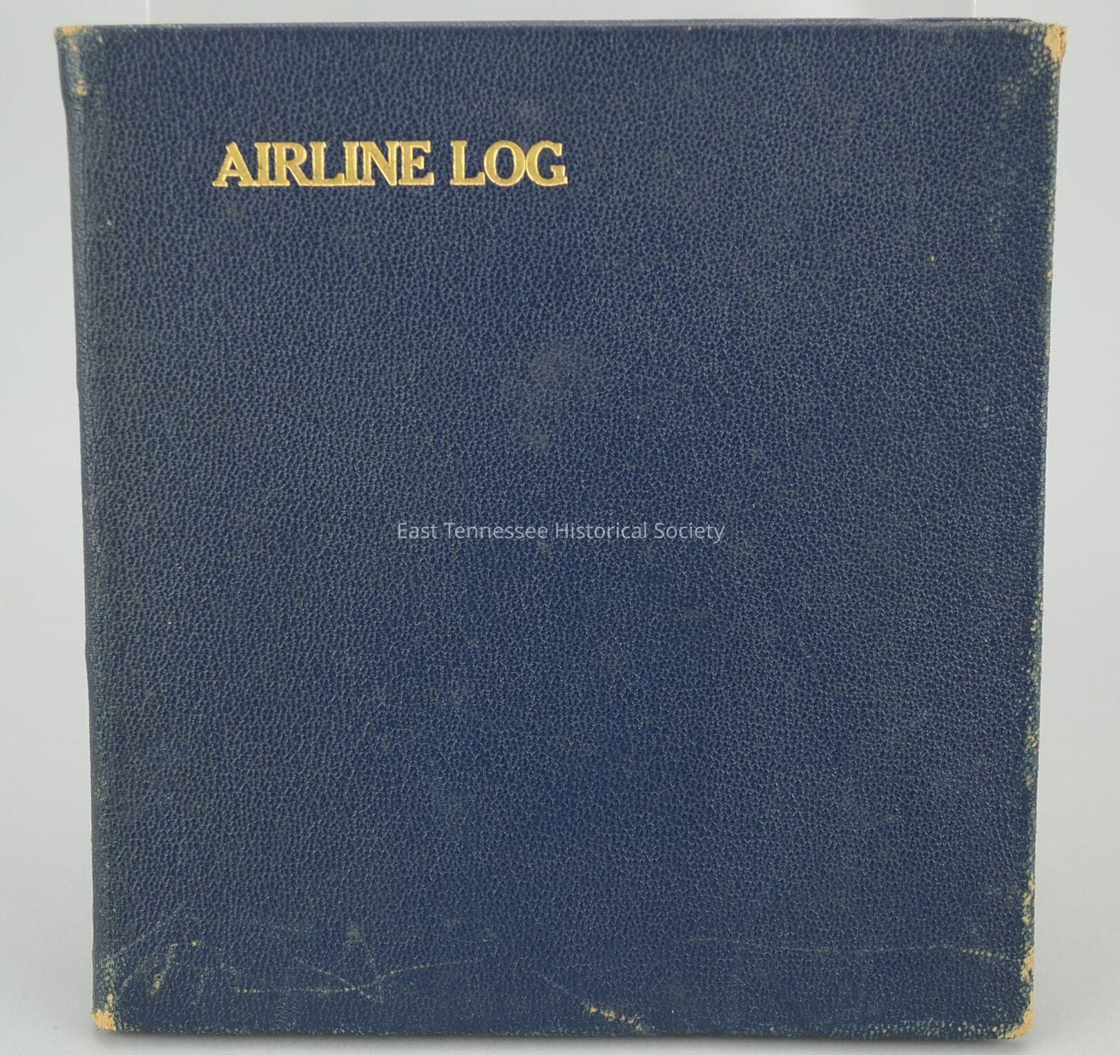 Airline logbook of Esther Carlson, navy-blue leatherette cover marked "AIRLINE LOG" in gold lettering at top left front, navy-blue satin fabric cover and flyleaf attachment sheet, "from Pete 8/29/39" inscribed on inside cover, "Stewardess - Esther Carlson / American Airlines Inc. / Memphis, Tennessee / 631 Reservoir Ave. / Auburn, R.I. [home address]," handwritten on flyleaf, "April 15-Sept 1st Approximately 425 hrs. on page 2/3, "Sept. 1939 - 9/2/39-9/23/39" with eleven flights from PS to NK on page 4/5, green ink on interior sheets with grid spreadsheet design, "Month of ____ Date / Type Aircraft / License Number / Type Engine / From / To / Remarks / Aircraft Classification …, 60 pages, Air Associates, Inc. (Chicago/Garden City, NY/Glendale, Cal/Love Field, Dallas/North St. Marshall, Mo), 6 1/2"h x 5 7/8"w x 3/8"d, 1939.Collection