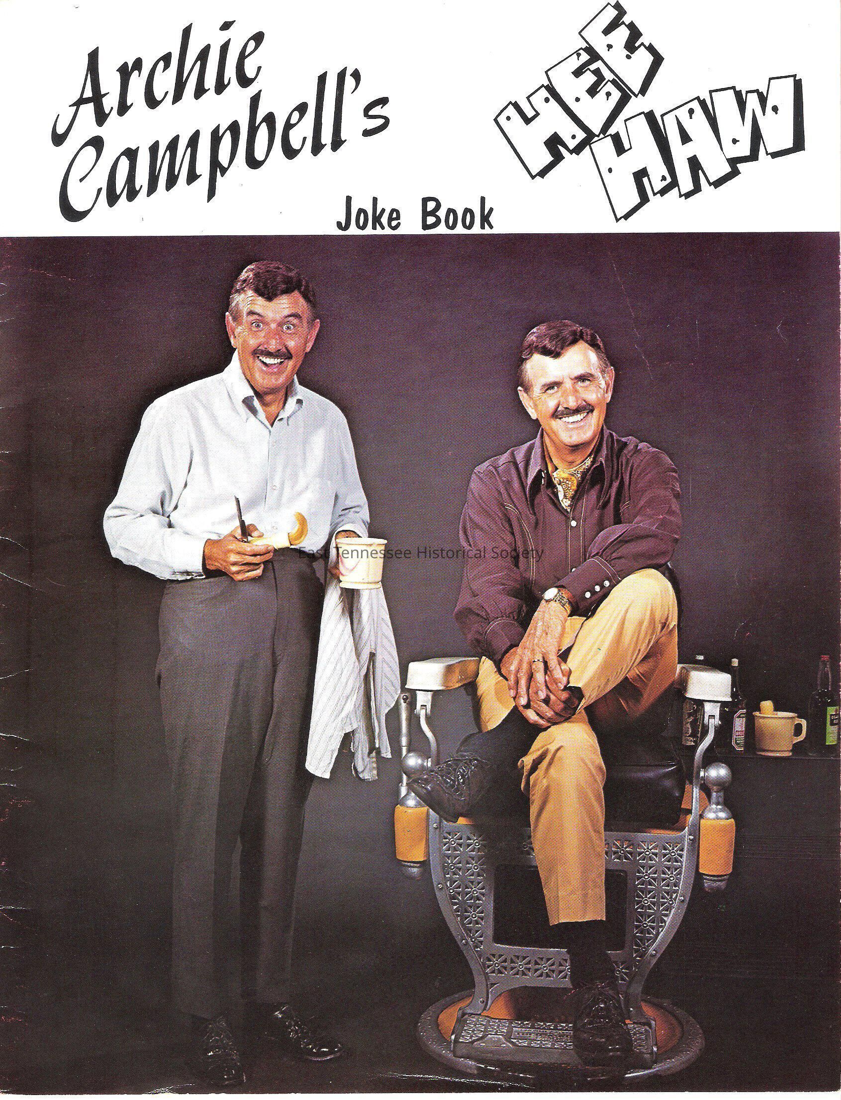 Booklet, paper, cover marked "Archie Campbell's / HEE HAW / Joke Book" with color photograph of Archie with shaving mug and razor standing beside Archie in barber's chair, stapled left edge, 12pp, 11"h x 8 1/2"w, date unknown/c. 1970s. Penciled numbers at bottom of some pages.Collection