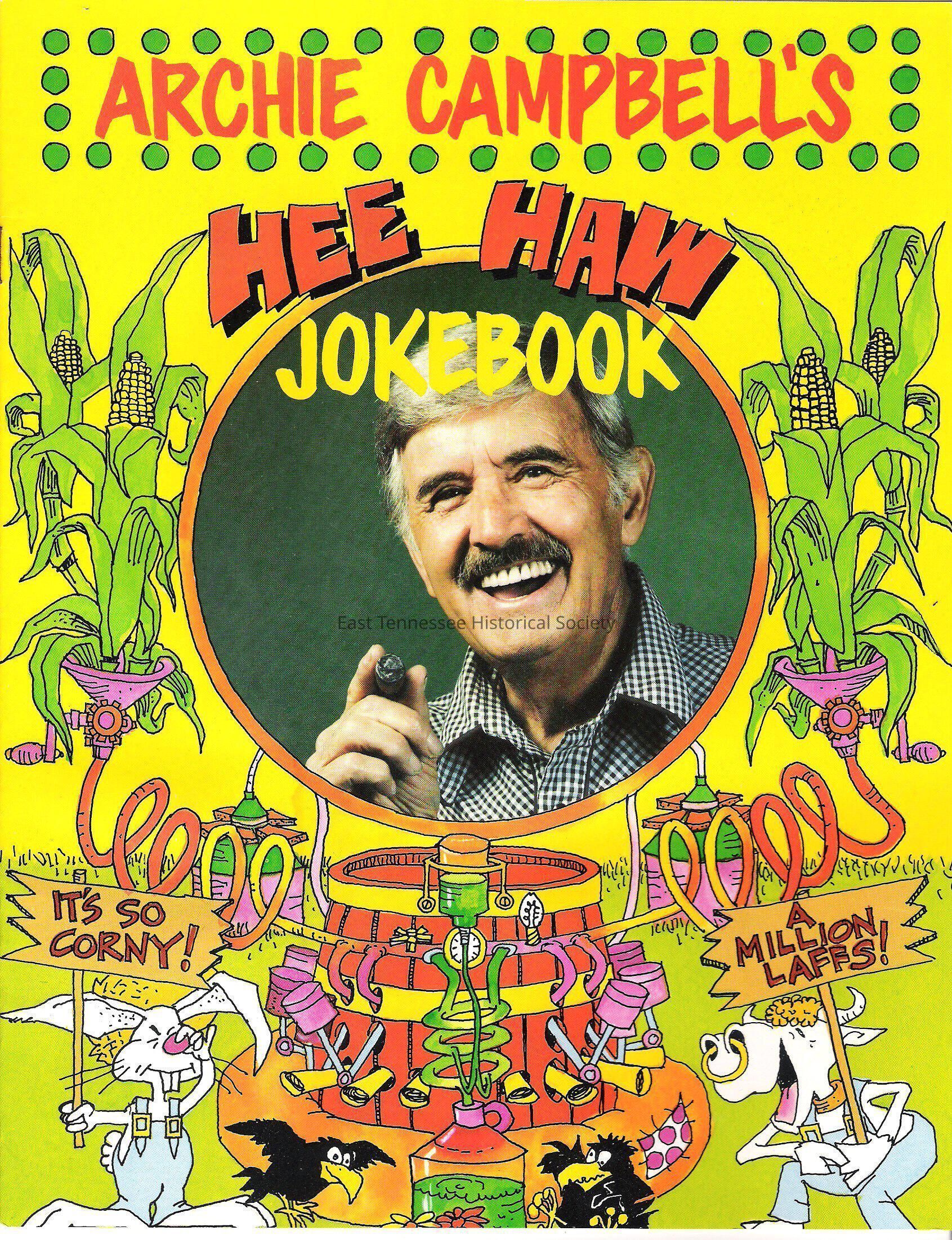 Booklet, paper, cover marked "Archie Campbell's / HEE HAW / Joke Book" with color photograph of Archie in center medallion with cartoon illustrations to either side and below of whisky still/crows/rabbit holding sign "IT'S SO / CORNY!"/bull holding sign "A / MILLION / LAFFS!," stapled left edge, 12pp, 11"h x 8 1/2"w, c. 1970sCollection