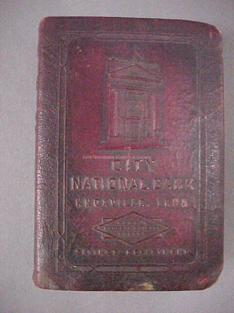 Savings Bank "City National Bank Knoxville, TN" made to look like a book. Maroon and gold, spine reads "Save / and / Have Benjamin Franklin" On top there is a slot for coins and on the side there is a keyhole. Key is missing. 5.25" x 3.625" x 1"Dimensions
