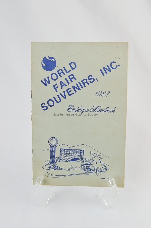 "World Fair Souvenirs, Inc.", "1982", "Employee Handbook". Light blue handbook for employees, with dark-blue sketched illustration of World Fair grounds.Dimensions