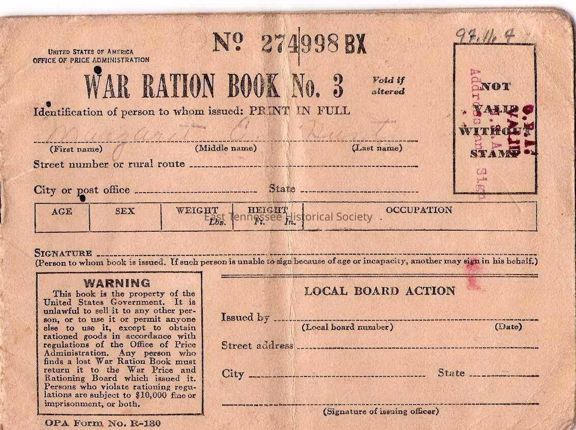 War Ration Book #three issued to Margaret Eleanor Hunt, WWII.