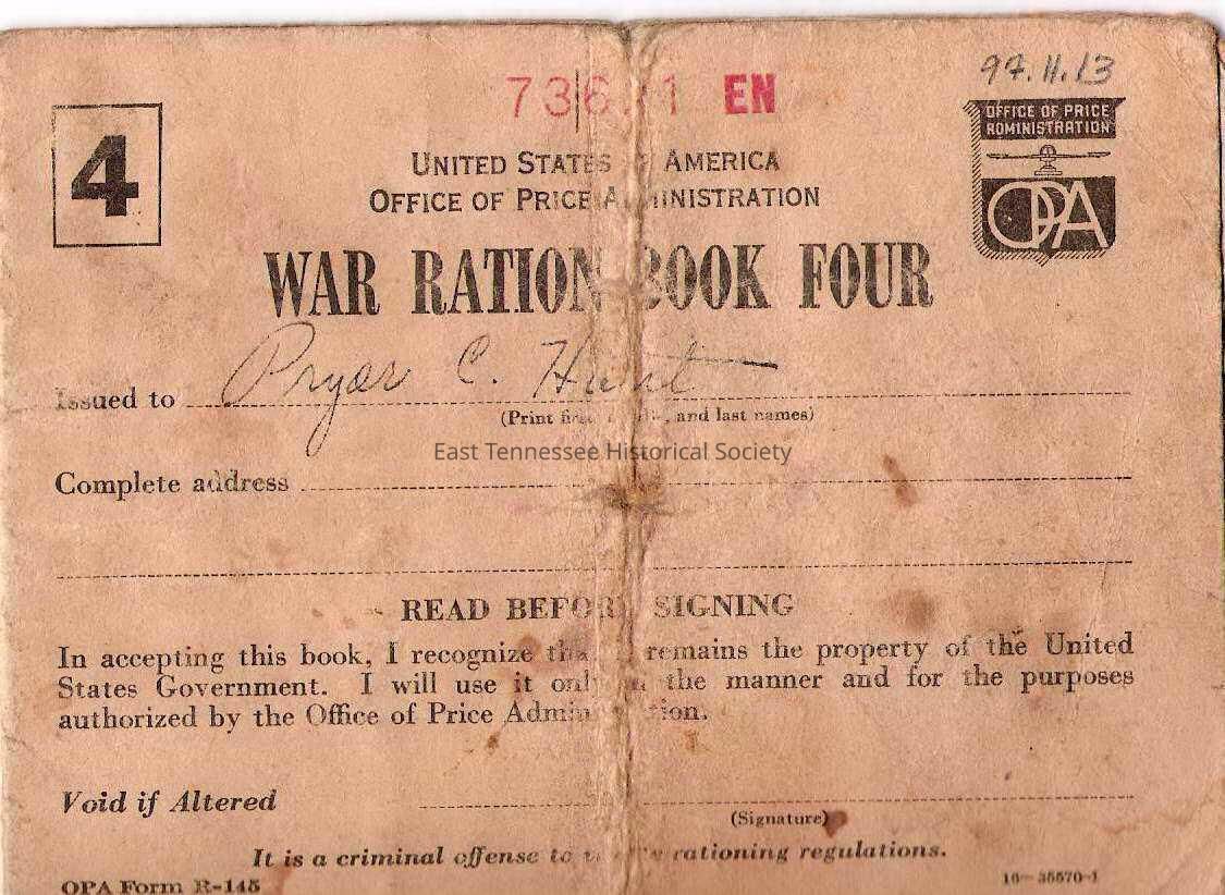 War Ration Book #four issued to Pryor C. Hunt, Jr., WWII.