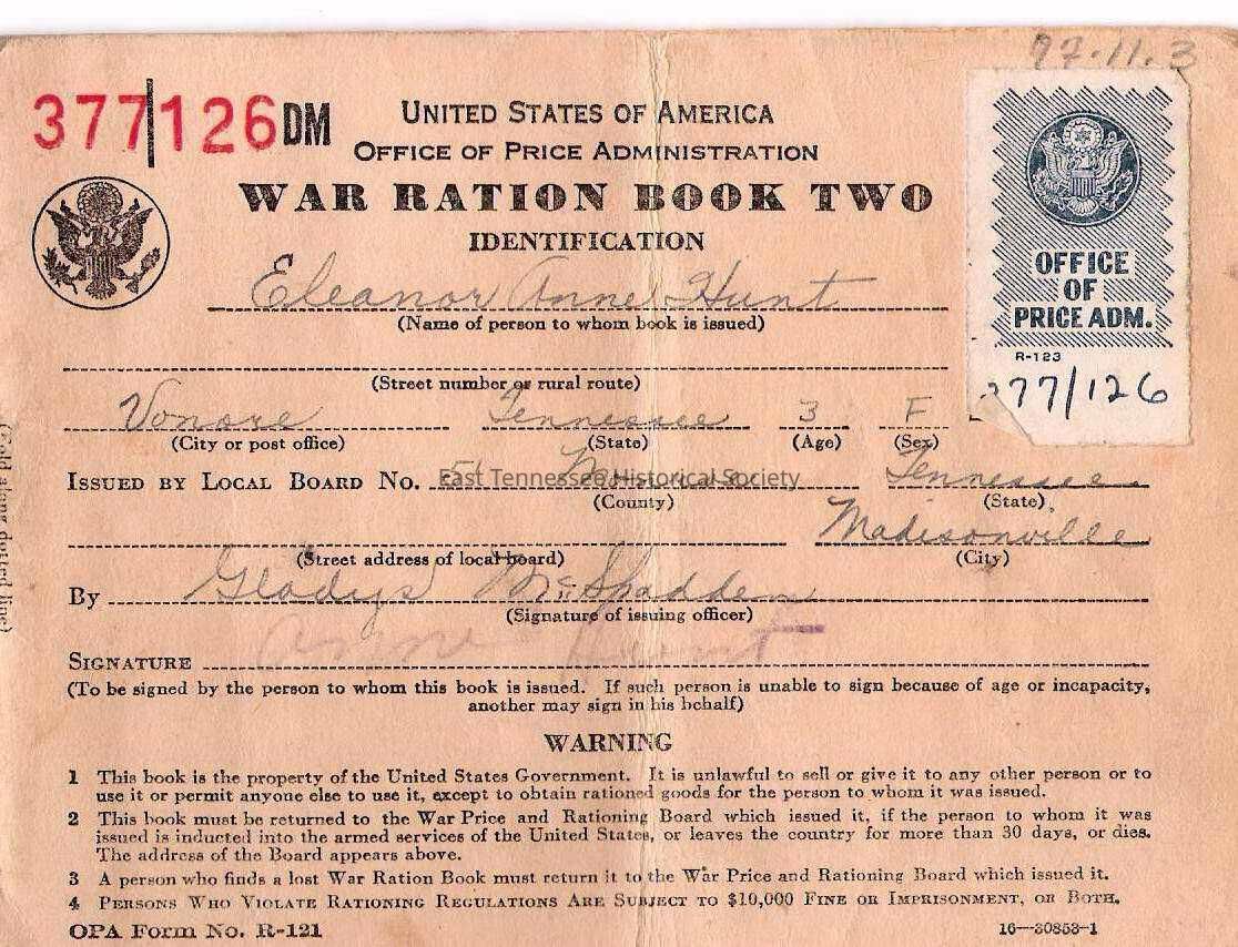 War ration book #two issued to Eleanor Anne Hunt, WWII.