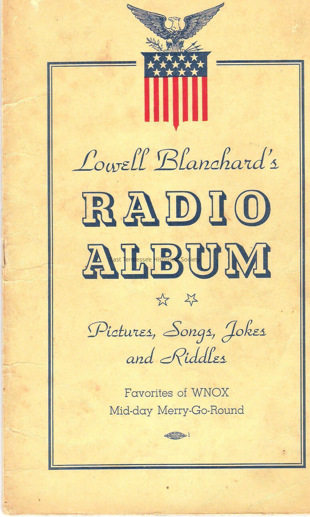 Booklet "Lowell Blanchard's / RADIO ALBUM / Piictures, Songs, Jokes / and Riddles / Favorites of WNOX / Mid-day Merry-Go-Round," pale yellow cover with blue lettering/spread-wing eagle above Union shield at top center, b&w photographs, 32pp, staple binding, 9 1/4"h x 6"w, 1943 (undated, but p1 gives Blanchard 's age as 33).