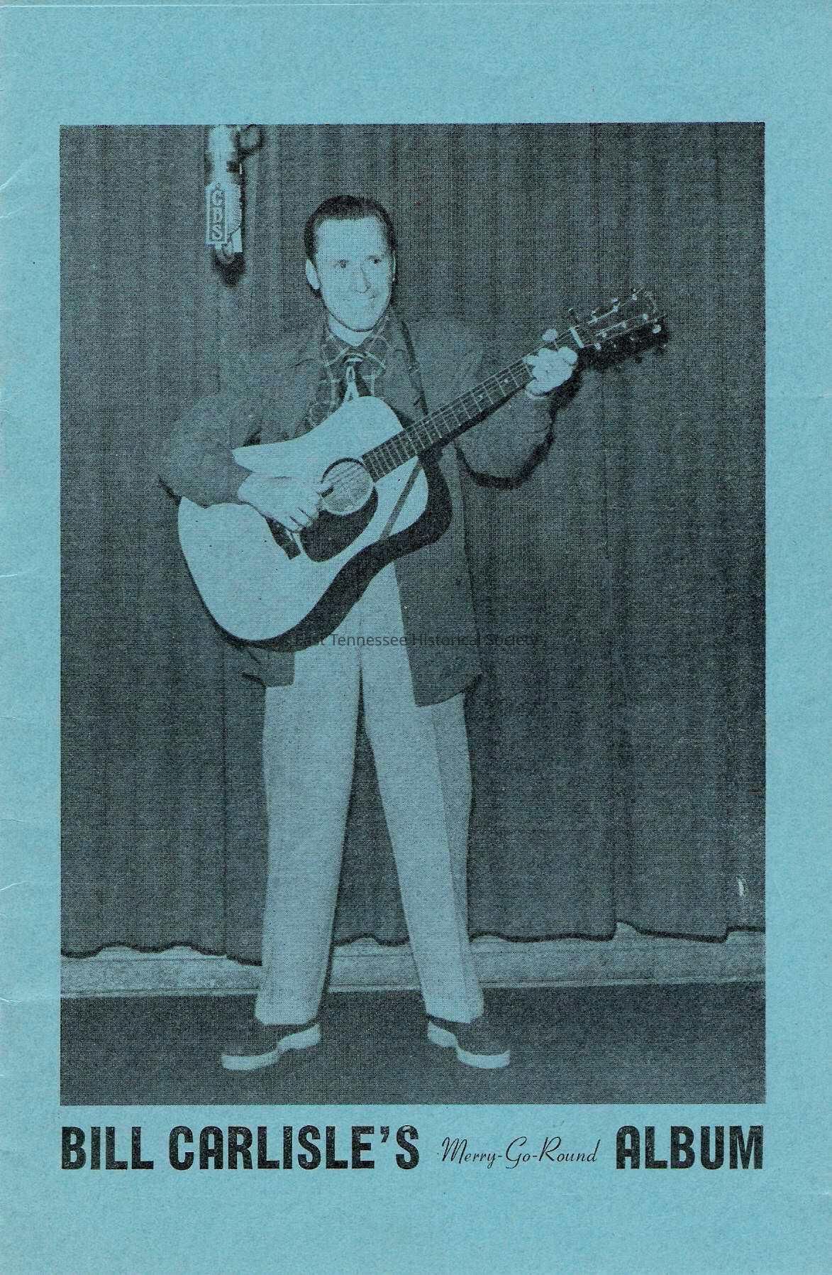 a) Songbook, blue paper cover marked "BILL CARLISLE'S Merry-Go-Round ALBUM with photo of Carlisle holding guitar, includes lyrics and photos (Hot Shot and his four-legged rooster, Carlisle children, Lowell Blanchard, Blanchard children), stapled, 9"l x 6"w, c. 1951.