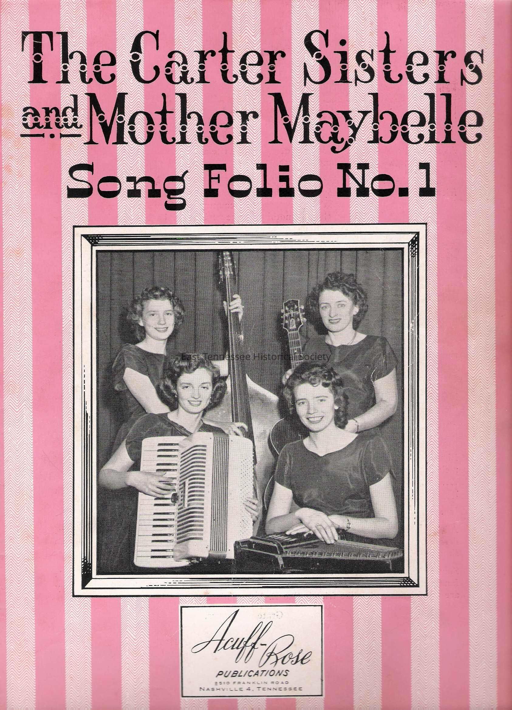 a) Songbook, pink striped paper cover marked "The Carter Sisters/ and Mother Maybelle/ Song Folio No. 1" with group photo with instruments, includes bios, lyrics/music and photos, Acuff-Rose Publications (Nashville), stapled, 12"l x 9"w, 60 cents, c. 1949.