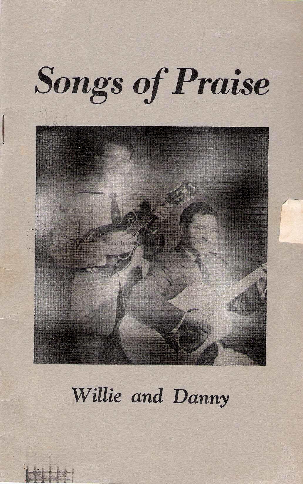 a) Songbook, gray paper cover marked "Songs of Praise/Willie [Brewster] and Danny [Bailey] with photo of the two with instruments, back marked from "WILLIE G. AND DAN/ WIVK RADIO STATION / KNOXVILLE, TENNESSEE" to "MISS CHRISTINE MCKINNEY/ ROUTE ONE/ WHITE PINE, TENNESSEE" on mailing label, undated postmark, 3 cent New Hampshire stamp, includes lyrics and photos (plus Cas Walker's grandchildren), stapled, 8 ¼"l x 5 3/8"w, 1955.