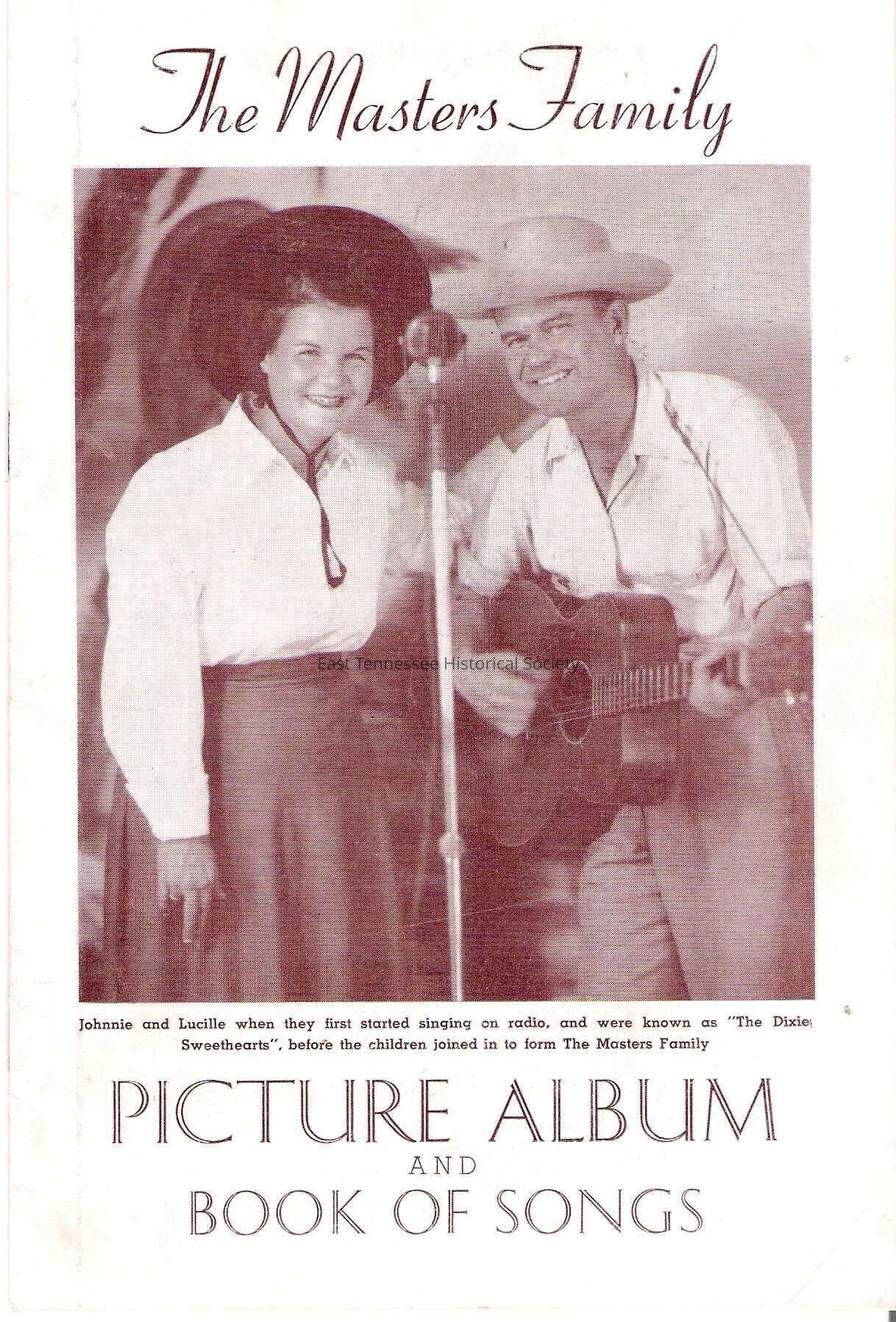 a) Songbook, white paper cover marked "The Masters Family/ PICTURE ALBUM/ AND/ BOOK OF SONGS" with photo of Johnnie and Lucille (formerly known as the Dixie Sweethearts), includes lyrics and photos, 9"l x 6"w, c. 1947. Excellent, appears unused, light discoloration and gray rub line along left edge, gray dot at lower right cover photo, crease at bottom right front corner.