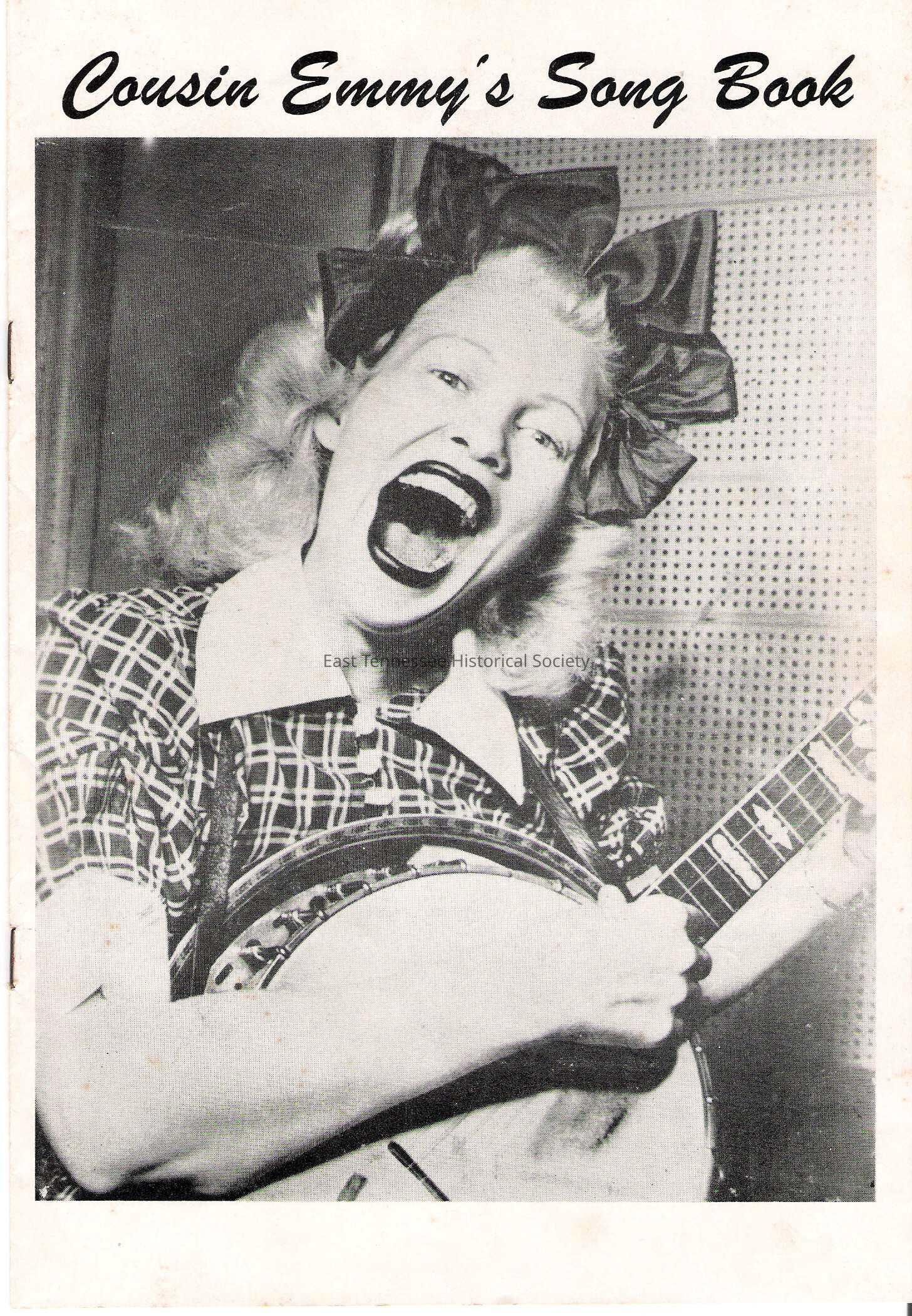 a) Songbook, white paper cover marked "Cousin Emmy's Song Book" with photo of Emmy (wide mouthed) with instrument, includes bio, lyrics and photos, stapled, 10 ½"l x 7 ¼"w. Good, scattered light foxing on cover, light rust on staples.