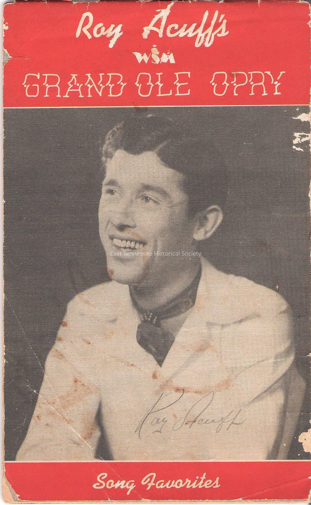 Booklet, "Roy Acuff's/ WSM/ GRAND OLE OPRY/ Song Favorites," bust portrait of Acuff on front cover, signed (printed?) "Roy Acuff" in pencil/orange top and bottom border with white lettering, includes songs and b&w photographs, lists Smoky Mountain Boys and Girls as Rachel Veach, Velma Williams, Peter Kirby (Oswald), Lonnie (Pap) Wilson, Jess Easterday, and Odie, signed Peter Kirby Oswald, Sonny Day/WSM, Jay ?/WSM, Tommy Magness [hired in 1943] on reverse, 8 ½"h x 5 1/4"w, c. 1941-1943.Made/Created