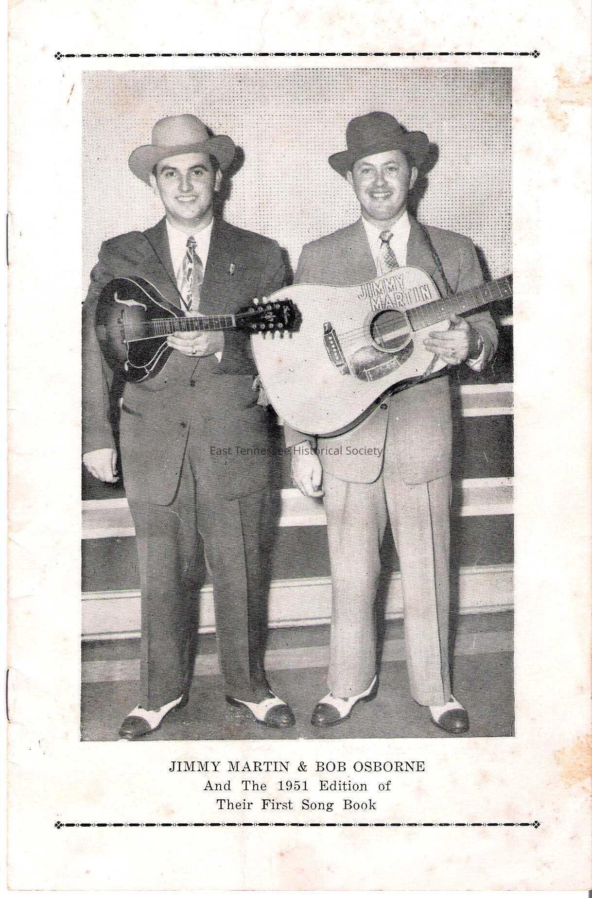Songbook, white paper cover marked "JIMMY MARTIN & BOB OSBORNE/ And Their 1951 Edition of/ Their First Song Book" with photo of the two holding instruments, reverse marked from "Jim Martin/WIBK/Knox Tenn" to "Genevieve McKinney/ Route 1/ White Pine," Nov. 19 1951 postmark, includes bios, lyrics and photos (Martins, Osbornes, Jam Up & Honey, Max Terhune & Elmer, Clements/Price/Monroe/Martin/Lyle), stapled, 9 1/4"l x 6, 1951. $10