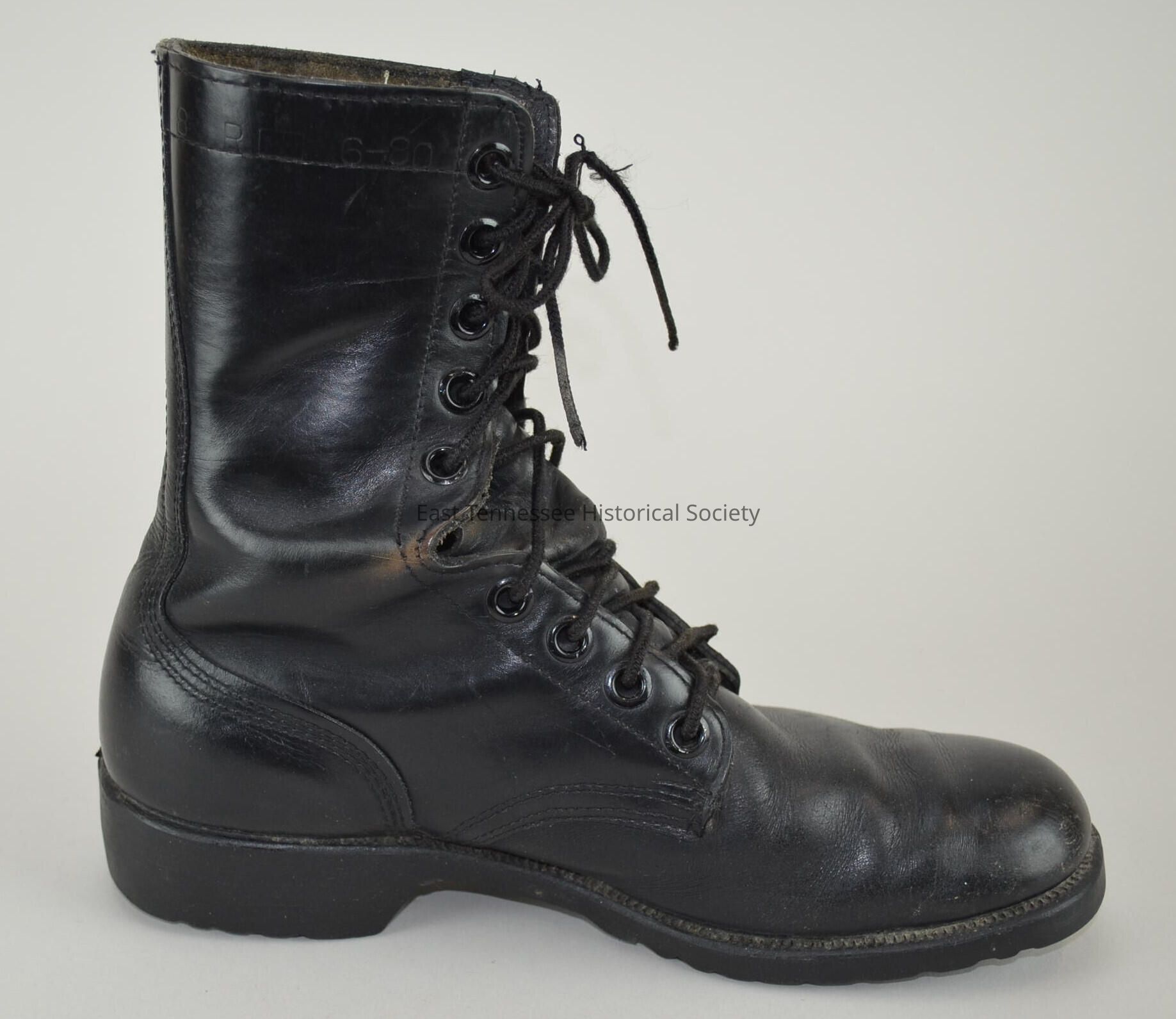 Pair of black leather boots, black rubber soles, nine pair of eyelets with black laces, "WICKIZER" written in black on interior of each, size? / "8R" embossed on soles, 2001.Collection