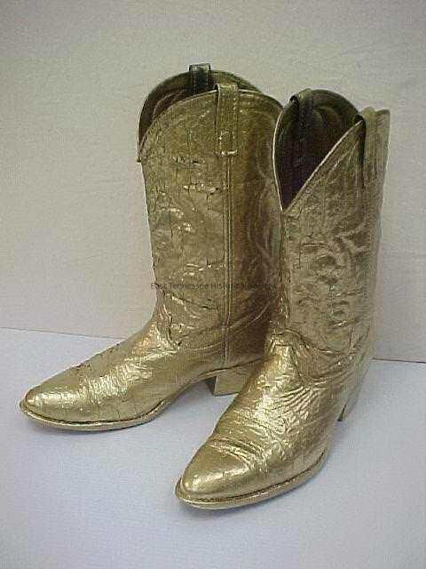 Pair of cowboy boots worn by "Sunshine Slim" during performances--a) left, b) right, leather painted 18k gold, interior stamp reads "4563 845001 11D/ 292/ A [within circle]/ MAN MADE MATERIAL IN SOLE/ FORTIFIED LEATHER," interior tag at upper left right boot has American flag and reads "Made in U.S.A." (believed made in California), c. 1980.Collection