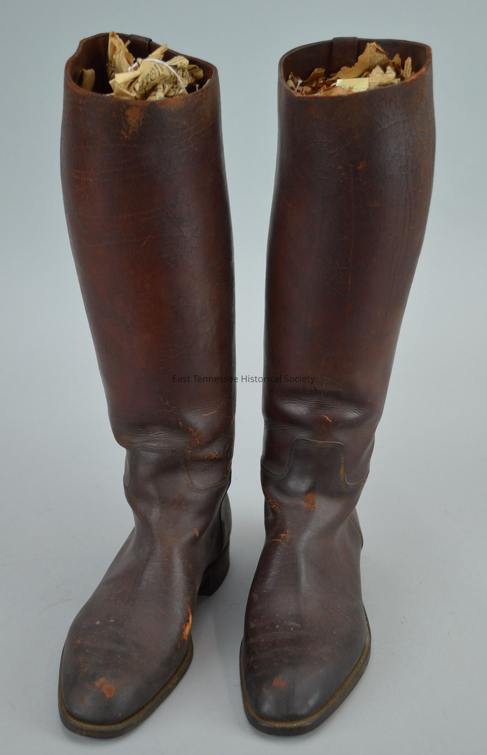 Pair of knee-high riding boots [used with jodhpur breeches] of Robert LaForge, dark-brown leather, both soles marked "7 1/2 C" perpendicular to "A.E. NETTLETON CO. / SYRACUSE, N.Y., U.S.A." [in gold lettering] at left, interior fronts marked "NEW YORK [in black lettering], manufactured by A.E. Nettleton (Syracuse, NY), 17 1/2"h x 4"w. 1917.Made/Created