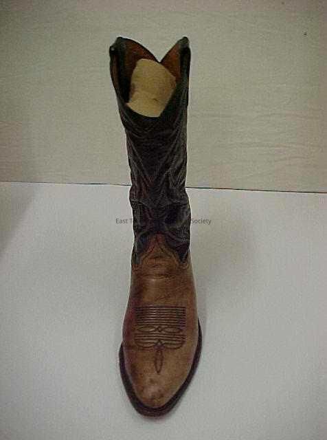 Pair of brown/dark brown leather cowboy boots, abstract design at foot and leg, interior fitted with wood stay in shoe and cardboard in the leg. Condition: good, some wear to soles, crushed cardboard in proper left boot.Collection