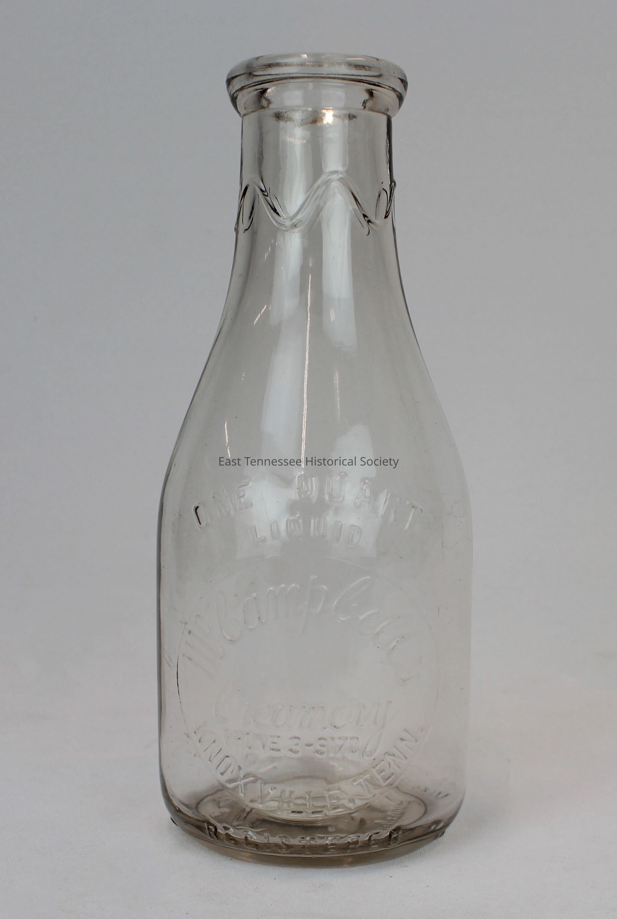 McCampbell's Creamery milk bottle, clear glass, embossed wavy line around neck (giving impression of dripping milk), obverse embossed "ONE QUART / LIQUID / McCampbell's [in script] / Creamery [in script] / PHONE 3-9170 / KNOXVILLE, TENN." in lower half and "REGISTERED" at bottom rim, reverse embossed "SEALED BB 48" at bottom rim, embossed with large "MC" on base with "18 [oval over diamond symbol] 3" above and "Duraglas" [in script] below, 9 1/2"h x 4" diam., date unknown although possibly between 1911 and 1918.Made/Created