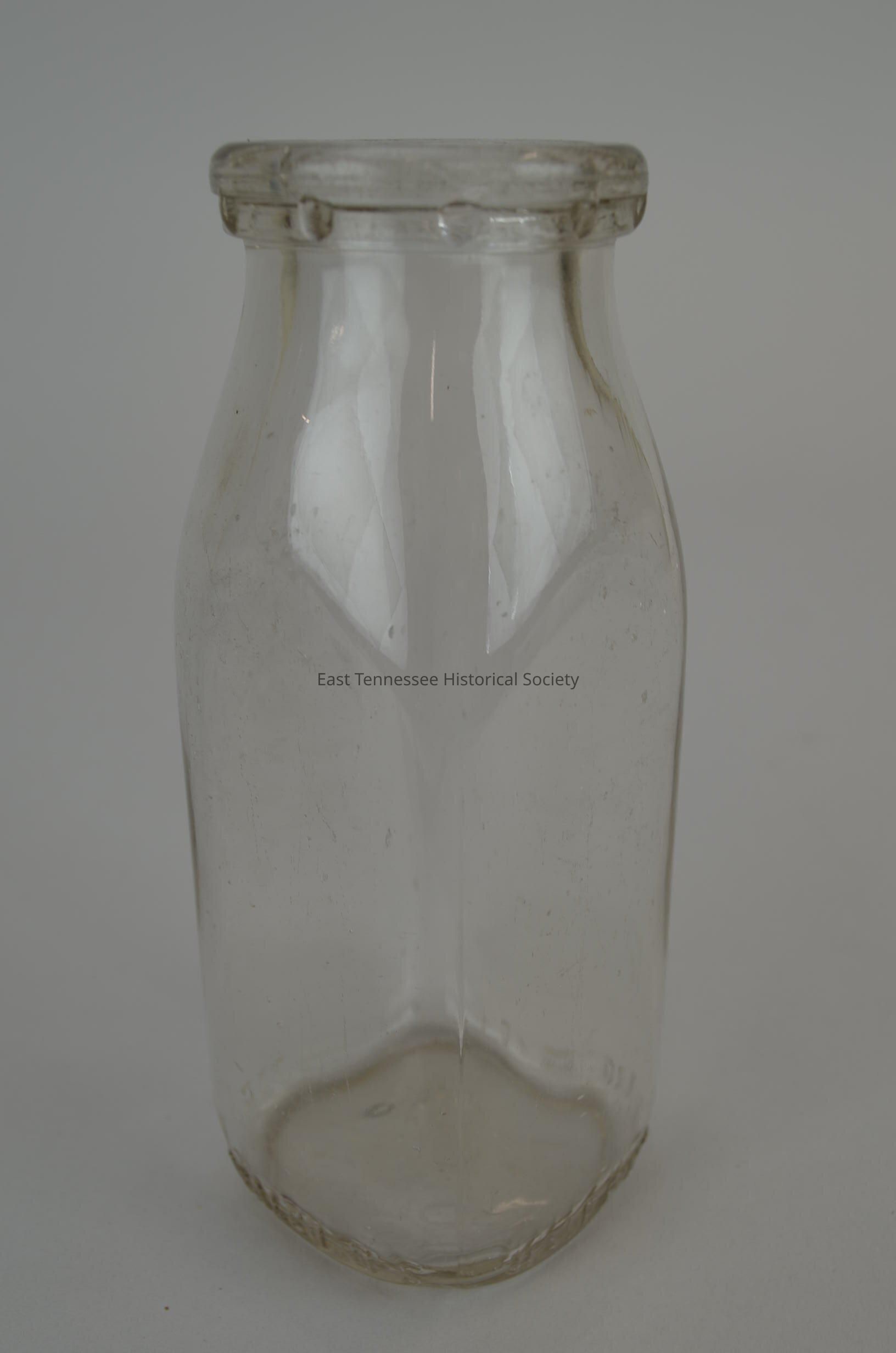 Milk bottle (half pint), clear glass w/o label, bottom edge embossed "HALF PINT / LIQUID / MIY REG / SEALED [Owens-Illinois symbol] S," base embossed X / 9 55 / Duraglas [in script], 5 1/2"h x 2 1/8"w x 2 1/8"d, 1955.Made/Created