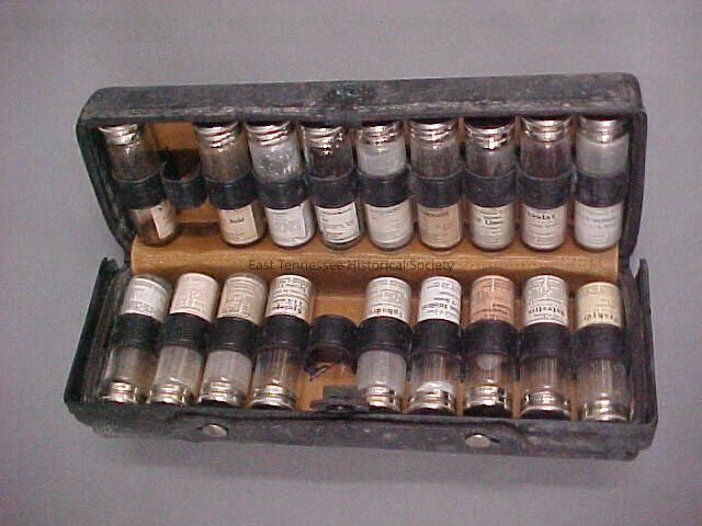 18 glass medicine bottles with silver lids, paper inserts take up less than half of inside bottle, tell content specifics, labels read "Prohydrion", "Natestrin", "Theobromine-Phenobarbital Compound", "Magnesium Trisilicate", "Ephedrate", "Cyclopal", "P-A-C with Cyclopal", "Phenobarbital and Belladonna", "Special Formula #2", "Acetylsalicylic Acid", "Silfathiazole, Upjohn", "Racephedrine Hydrochloride Upjohn", "P-A-C Comound", "Salicyl and Phenacetin", "Iodized LIme", " Phenolax", "Dehydrochloric Acid" One bottle has label turned around - hand written is "Savorrett / S". Original print on other side reads "Silfadiazine and Sodium Bicarbonate."