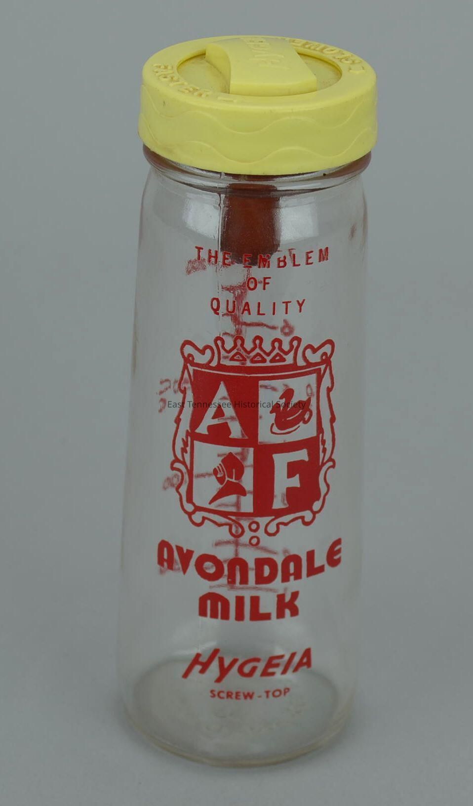 Baby bottle, glass with plastic nipple inside, two-piece yellow plastic screw top, glass marked "THE EMBLEM OF QUALITY AVONDALE MILK / HYGENIA / SCREW-TOP" in red with stylized crest design, measurements in OZ and CC on reverse, bottom embossed "PAT 136888 / MADE IN USA / 124 A8," manufactured by Hygenia, 6 1/2" x 2 1/4" diam., 1950s.Made/Created