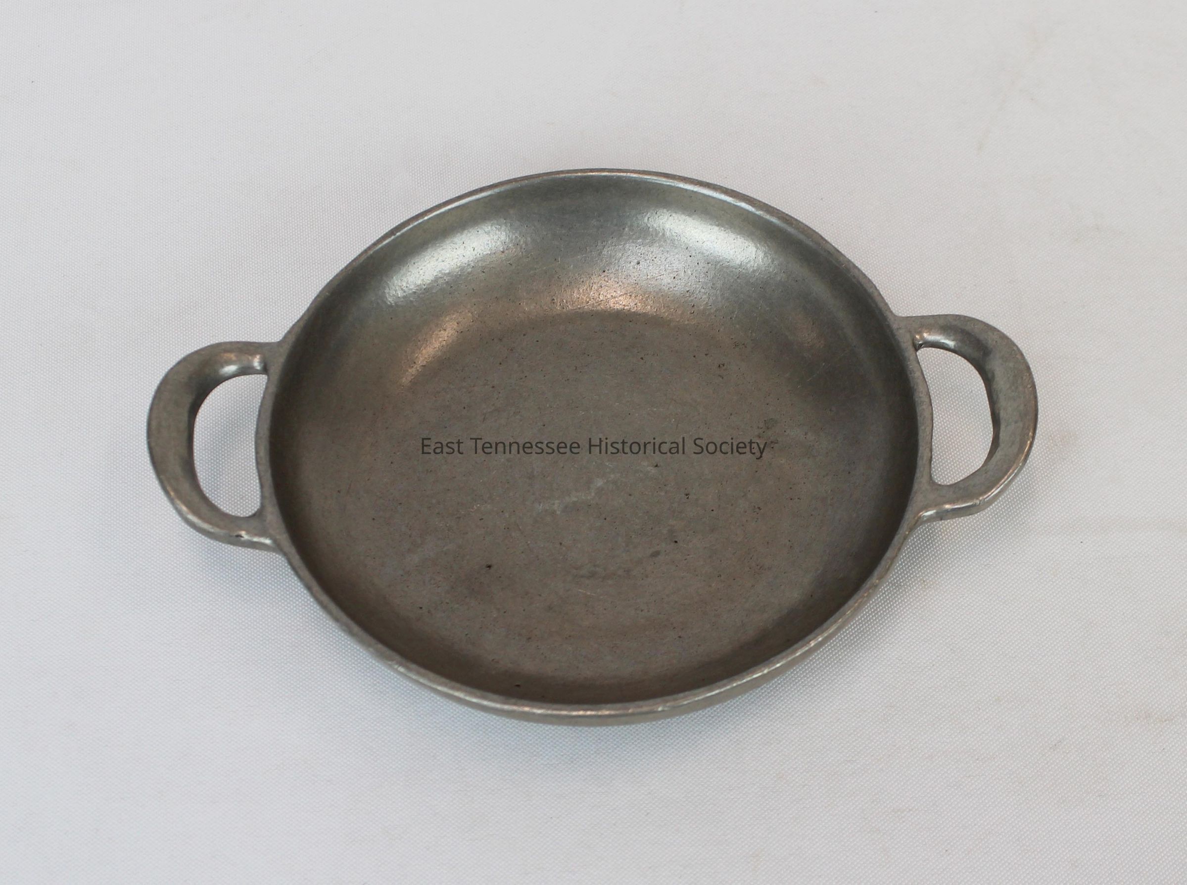 Bowl with two open handles used to serve creamed spinach at Regas Restaurant, round, metal (faux-pewter), plain design, 1"h x 7 1/2"w, 5 1/2"d, unknown manufacturer.Collection