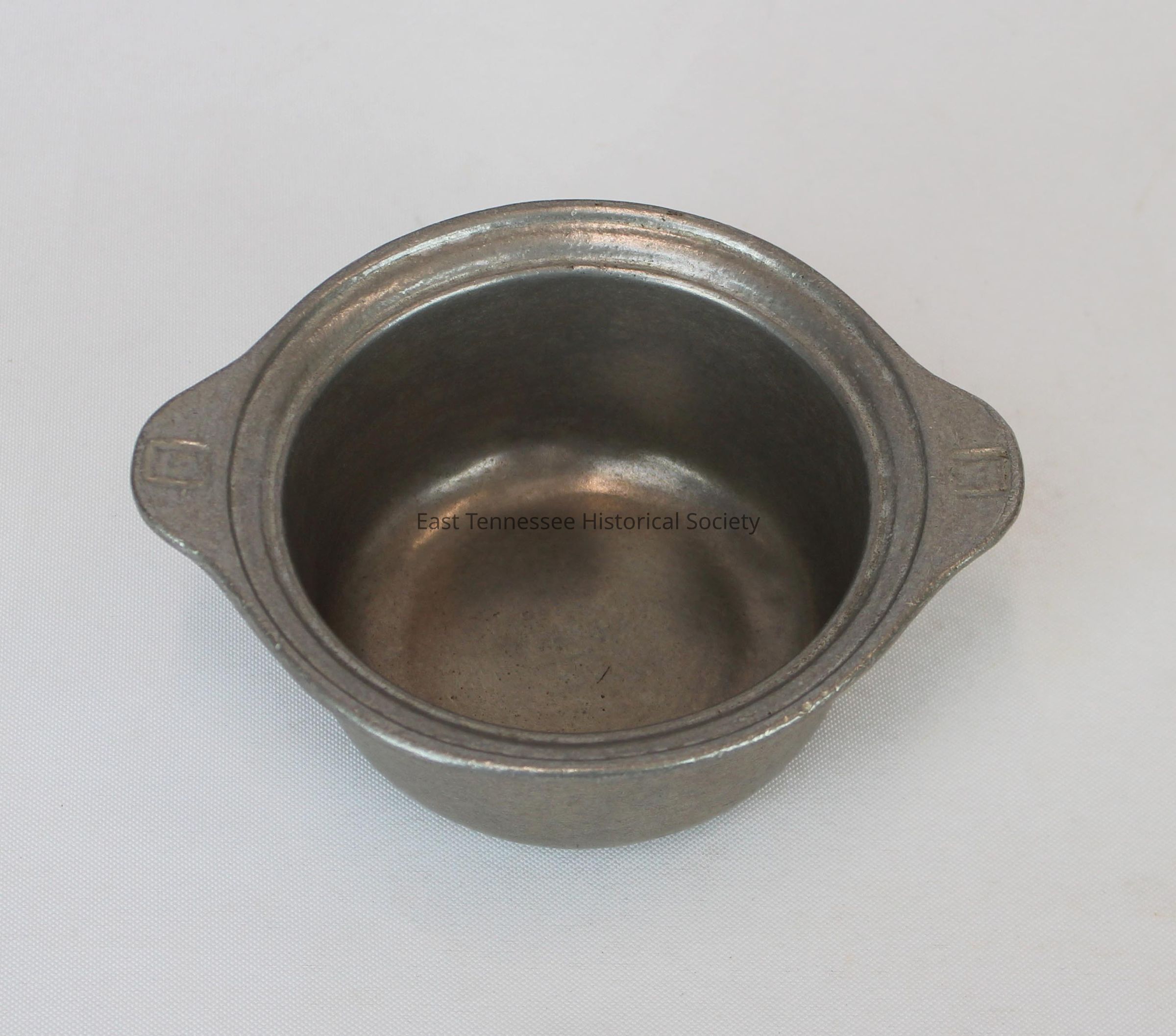 Soup bowl with protruding handle at each end used at Regas Restaurant, metal/armatale (aluminum alloy, faux-pewter), small deep bowl, Wilton Co. (Penn.), 2"h x 5 3/4"w x 4 1/2"d, perhaps 1970s?Collection