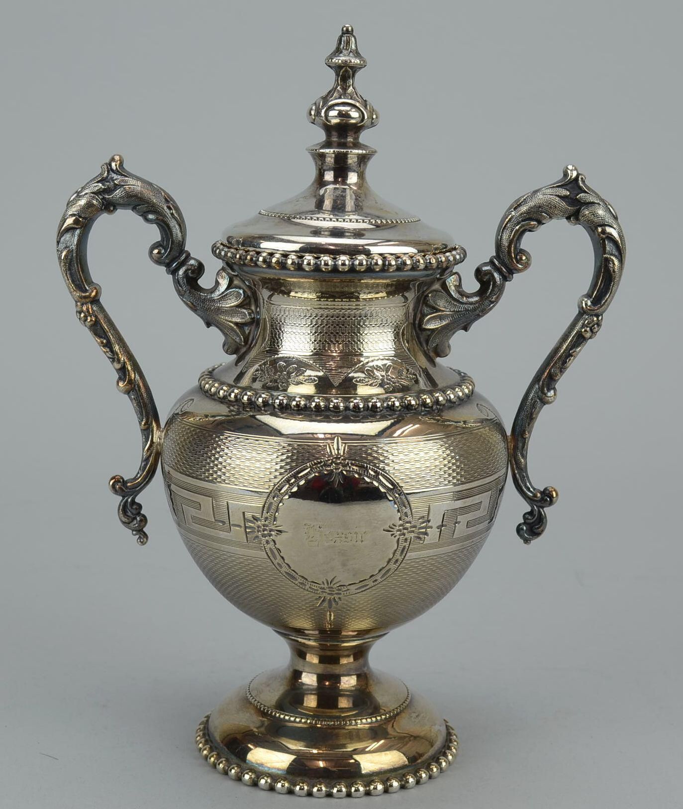 .5 Sugar bowl with separate lid, extra silver plate, uses Greek key design over pattern resembling basket weave, engraved "Hoxsie" in Old English font on front center nameplate, marked 6XX9.7 on interior lid, base stamped "[original manufacturer's name-rendered illegible] / COMPANY with "No. / 1835 / 5 [scratched out]" centered between, attached metal tag marked "ROGERS & BRO. [with star at either end] / EXTRA PLATE / WATERBURY CT.," base also marked 6XX9-7, manufactured by Rogers & Bro. (Waterbury, Conn.), 11 3/8"h x 7 1/2"w w/lid, 1866. Appears original manufacturer's name is rubbed out; attached metal tag shows Rogers & Bro.
