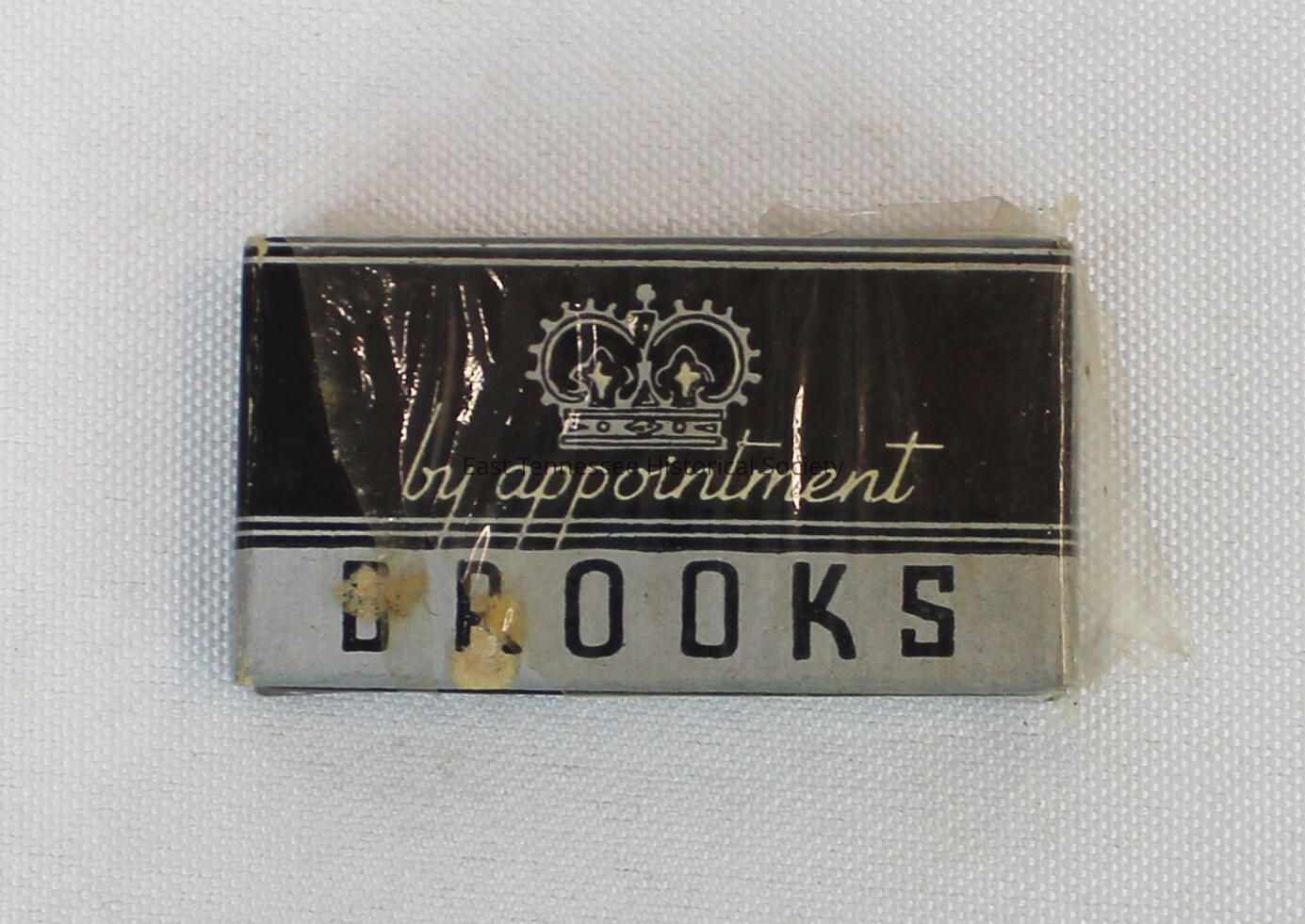 Box of razor blades belonging to Robert Barnes "Bob" LaForge Jr. (1885-1956), front marked "by appointment" [insilver script] on black background with crown above on top half, "BROOKS" in blackish silver below, top side marked "THE PEER OF BLADES," bottom side marked "RAZOR BLADES," right side marked "MADE IN U.S.A.," left side marked "DOUBLE EDGE," reverse features illustraton of building [possibly the company] with "TRADE MARK REG. U.S. PAT. OFF." below, 3/16"h x 2"w x 1"d, 1917-1918.Made/Created