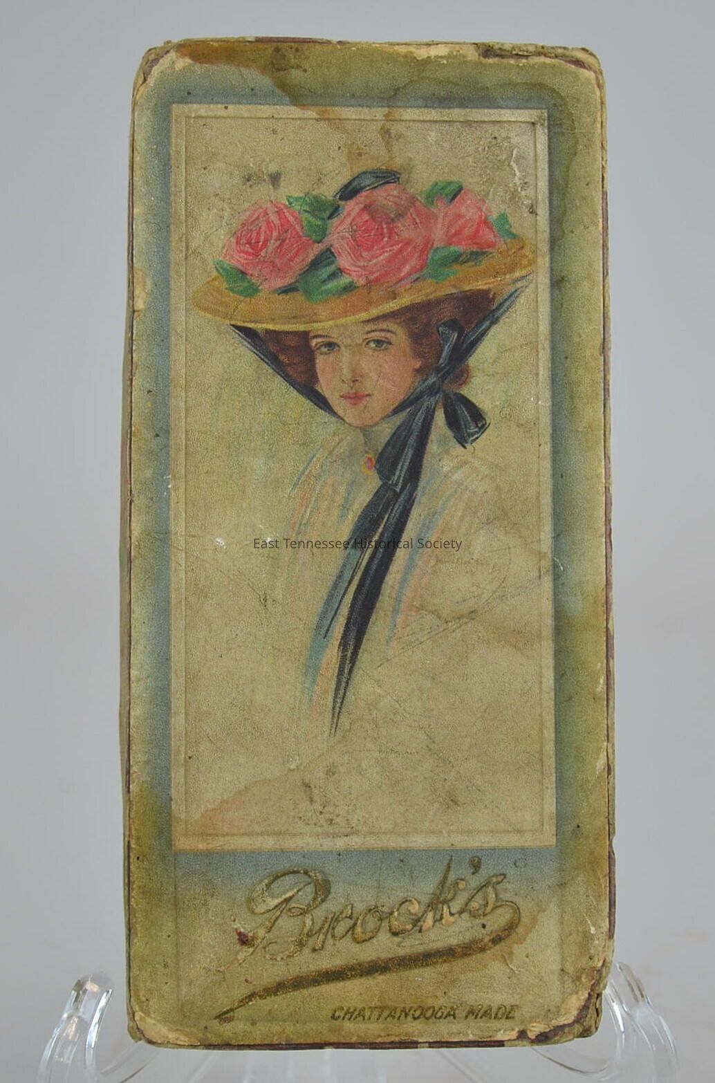 Brock candy box, two-piece cardboard container, illustrated paper glued to lid top/upper three-quarters shows woman wearing large hat topped with pink roses and tied with black ribbon under chin with bow to viewer's right, bottom fourth lid marked "BROCK'S [in italic script] / CHATTANOOGA MADE [in italics]" in gold lettering, side of lid decorated with overall floral illustration on textured paper, 7 5/8"h x 4"w x 1 5/8", c. 1915.Dimensions
