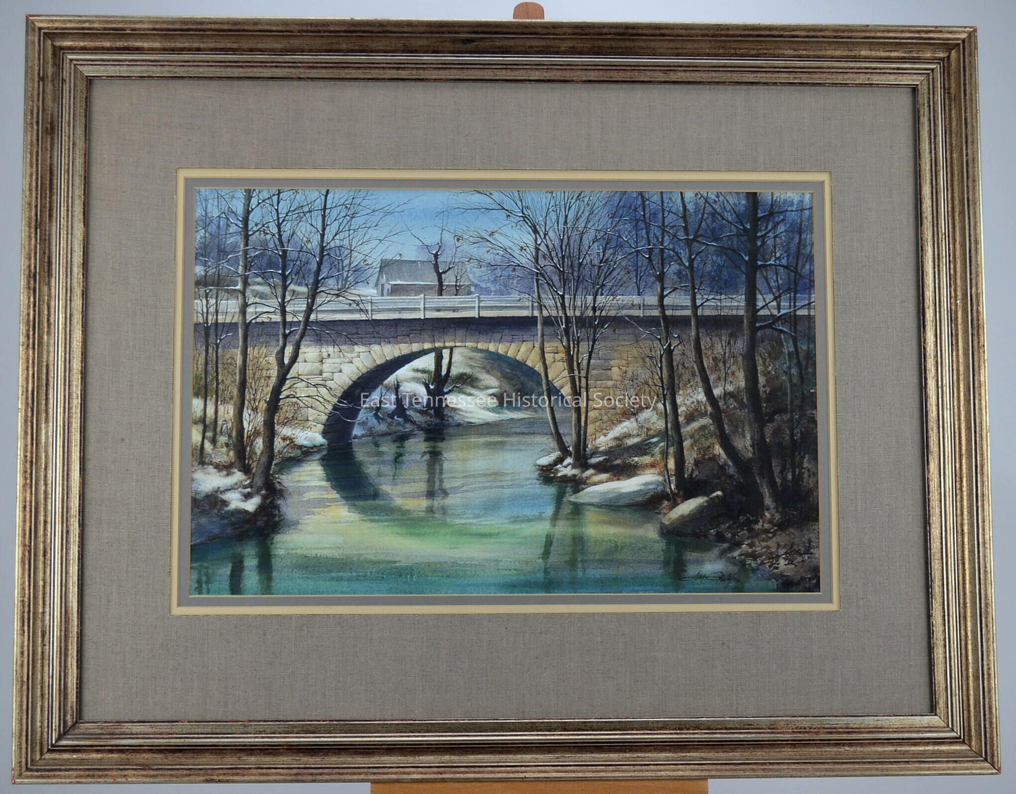 a) Painting entitled "Boyd's Creek Bridge" by Jim Gray, winter scene with single arch bridge over wide stream with bare trees and snow and barn in center background, signed "Jim Gray" at lower right corner, (print released1980).